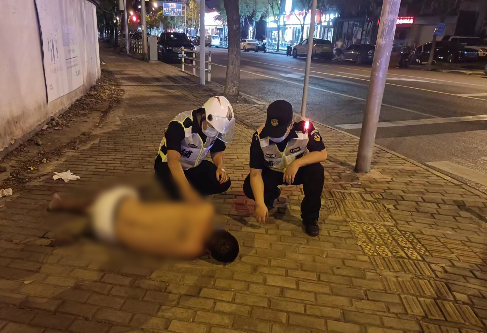 當(dāng)日23:30,張興安和楊龍巡邏至周東南路沈梅東路交叉口時(shí),發(fā)現(xiàn)一名男子躺睡在路邊,便立即上前察看。男子赤裸著上身,渾身散發(fā)著酒味。兩人多次試圖叫醒他,但男子酒可能喝得太多,依舊昏睡不醒。
