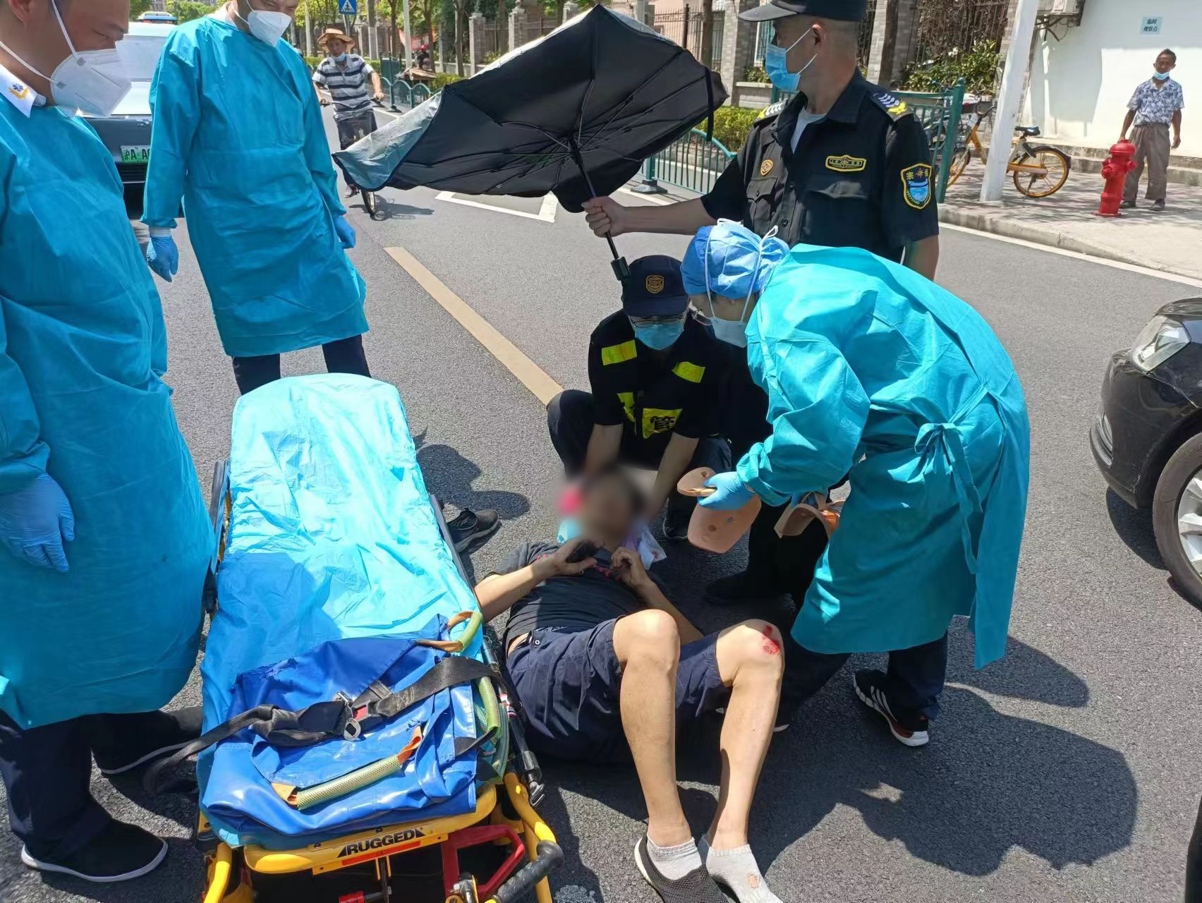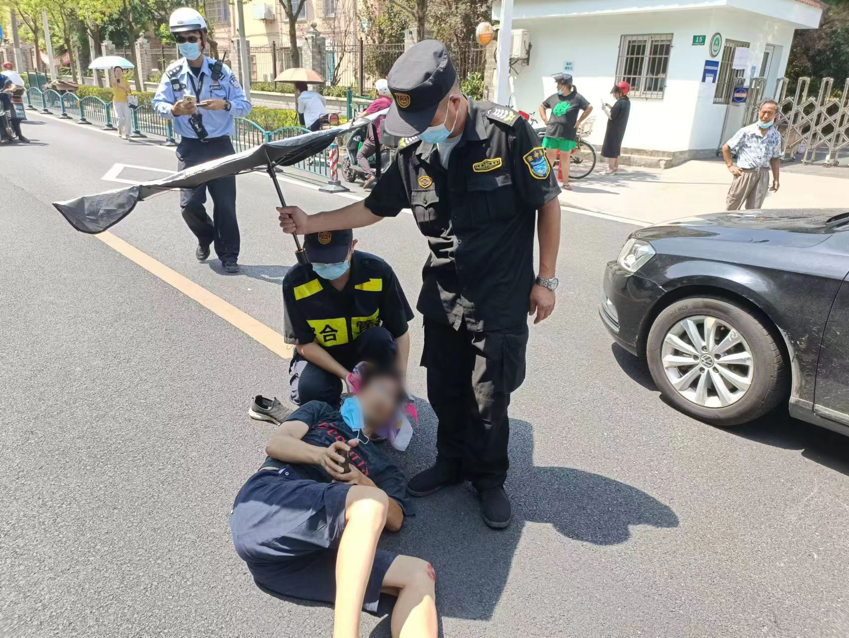 徐周趕緊上前蹲下,用手當(dāng)枕將男子頭部托住,同時(shí)不停地安慰著男子,周福濤則借來遮陽(yáng)傘為男子遮擋著烈日。