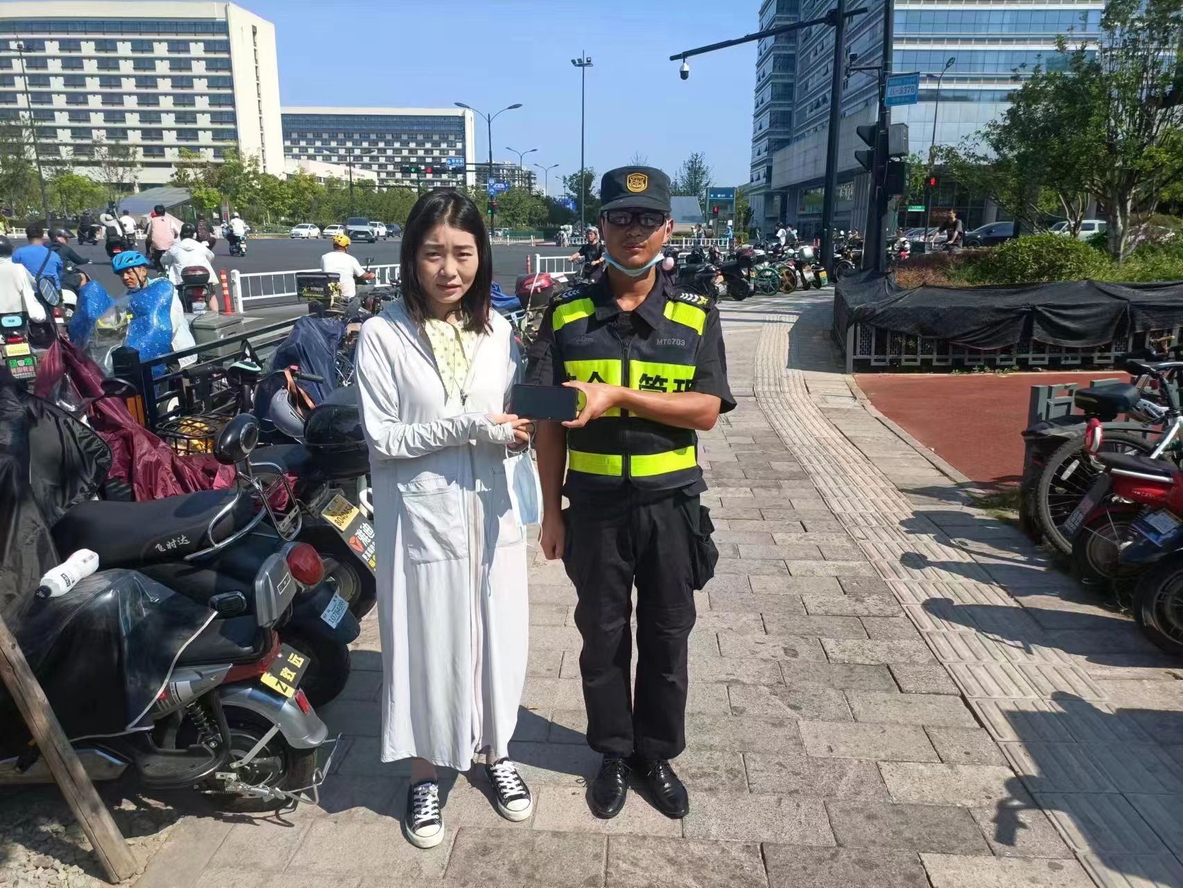 當(dāng)日9:47左右,丁建康巡邏至夏碧路人民廣場(chǎng)停車場(chǎng)入口時(shí),撿到一部黑色華為手機(jī),隨即上報(bào)帶班骨干,并按指示在停車場(chǎng)附近等待。