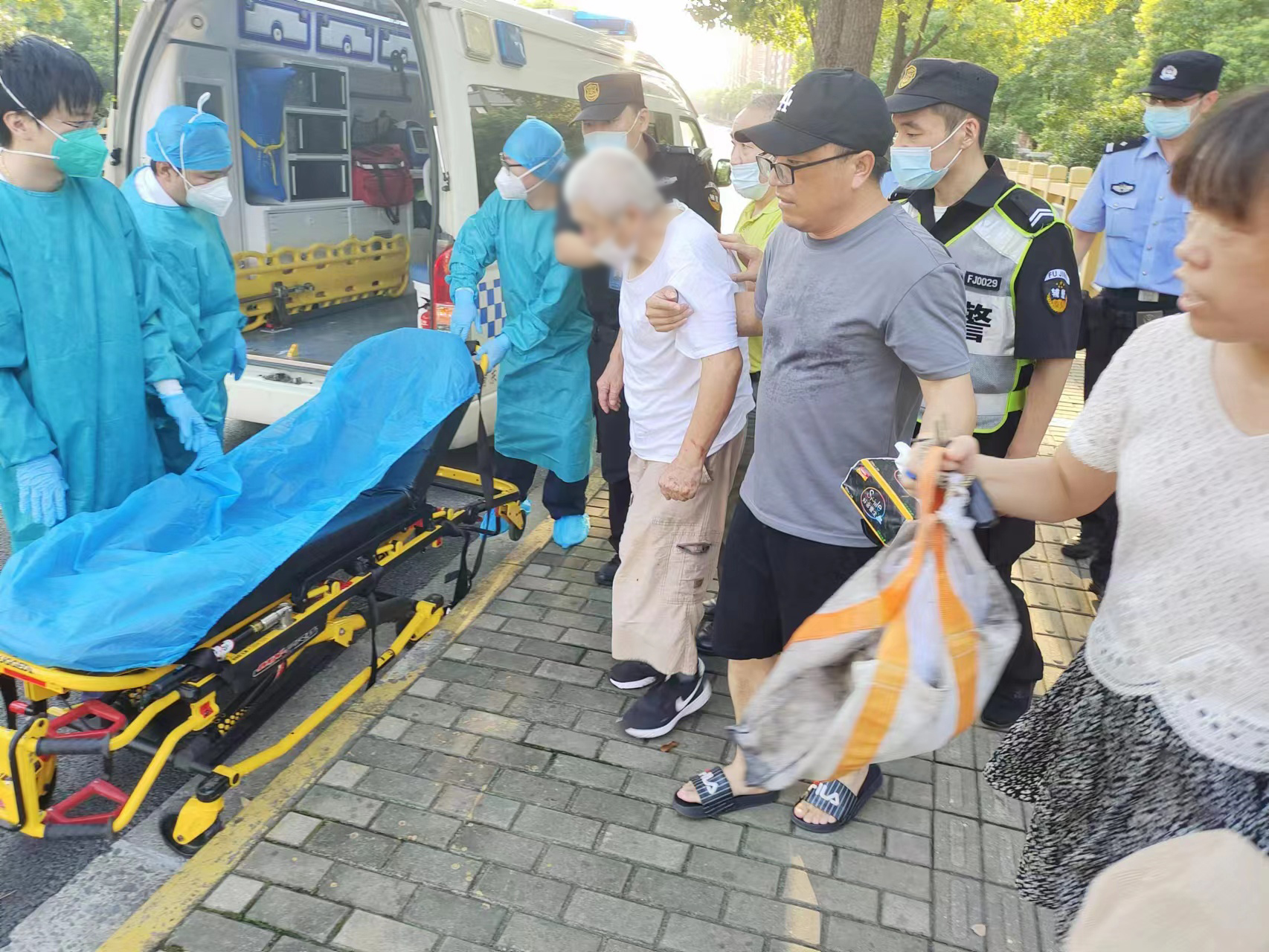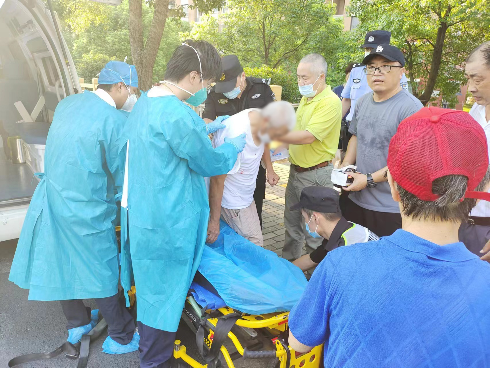 很快,民警和120救護(hù)車趕到了現(xiàn)場(chǎng),三人又協(xié)助醫(yī)護(hù)人員將受傷老人抬上救護(hù)車,由救護(hù)車送往醫(yī)院治療。