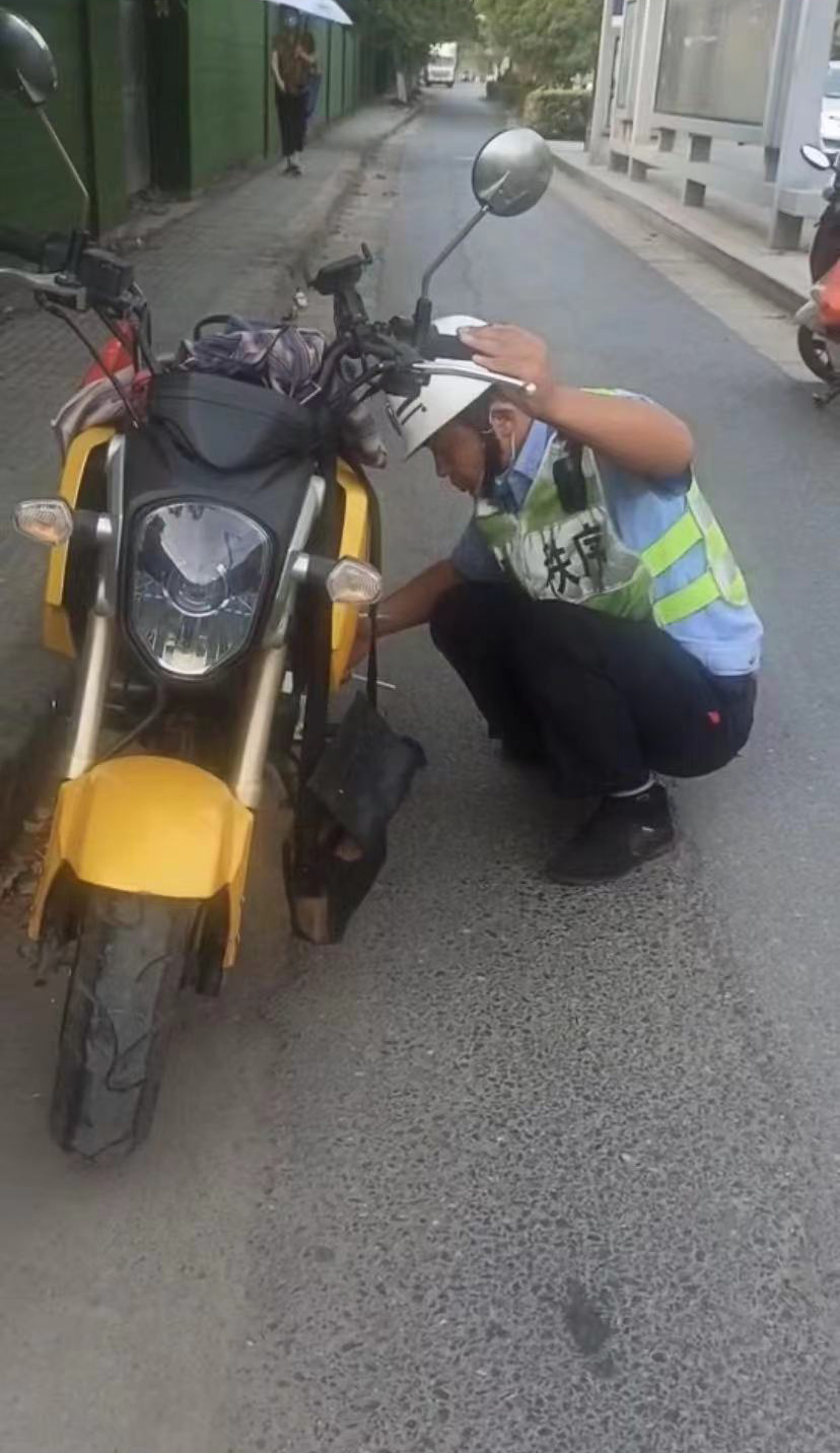 當(dāng)日6:50,郭耀坤上班途徑棕櫚路疫情卡點(diǎn)附近時(shí),看到一位老大爺滿頭大汗,推著一輛摩托車走走停停。見此情景,郭耀坤就主動(dòng)上前詢問。