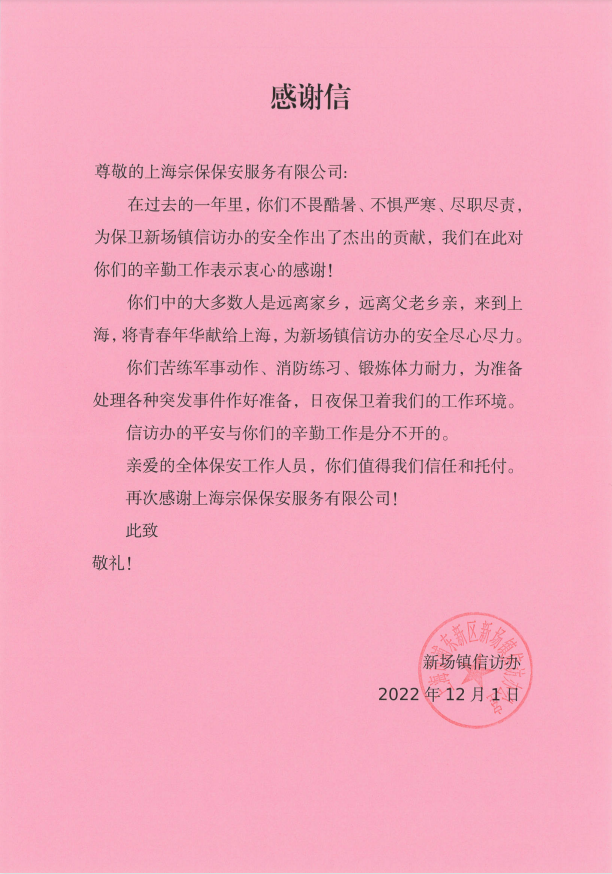 12月1日,宗保公司駐浦東新區(qū)新場(chǎng)鎮(zhèn)政府輔助項(xiàng)目收到鎮(zhèn)信訪辦送來(lái)的感謝信,信中對(duì)公司員工履職盡責(zé)的工作表現(xiàn)給予了充分肯定。