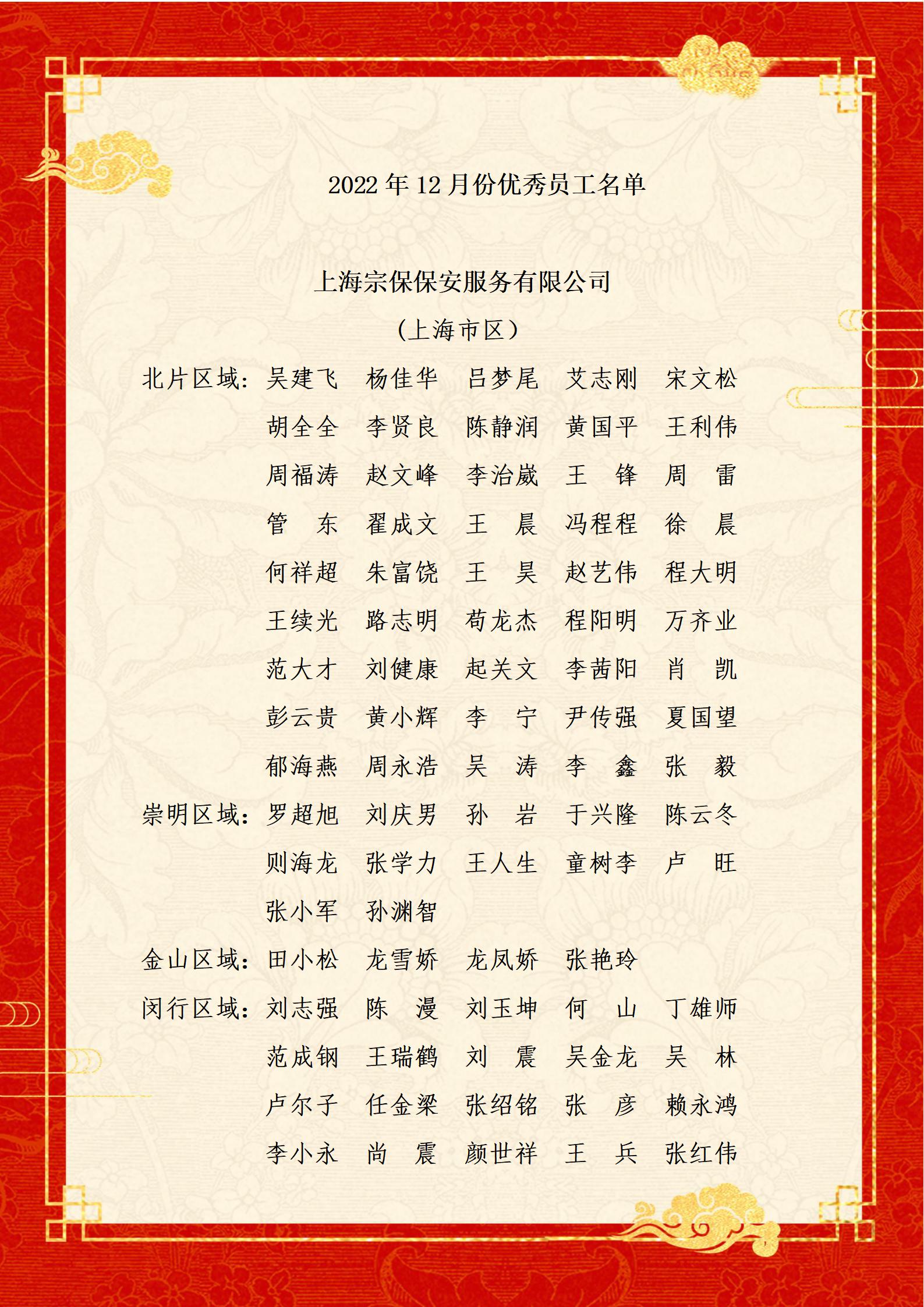 12月份,公司廣大員工根據(jù)甲方的任務(wù)部署,按照公司的工作要求,不怕濕寒、連續(xù)奮戰(zhàn),全力協(xié)助完成了上海市徐匯區(qū)第十七屆人民代表大會(huì)第二次會(huì)議安保任務(wù),勠力輔助進(jìn)行冬至祭掃安全保障,竭力配合做好城市管理、治安聯(lián)防、物業(yè)服務(wù)、生態(tài)保護(hù)、高鐵巡防等工作。期間,涌現(xiàn)出了一批盡心履責(zé)、崗位建功、拾金不昧、熱心助人的優(yōu)秀員工和先進(jìn)典型。