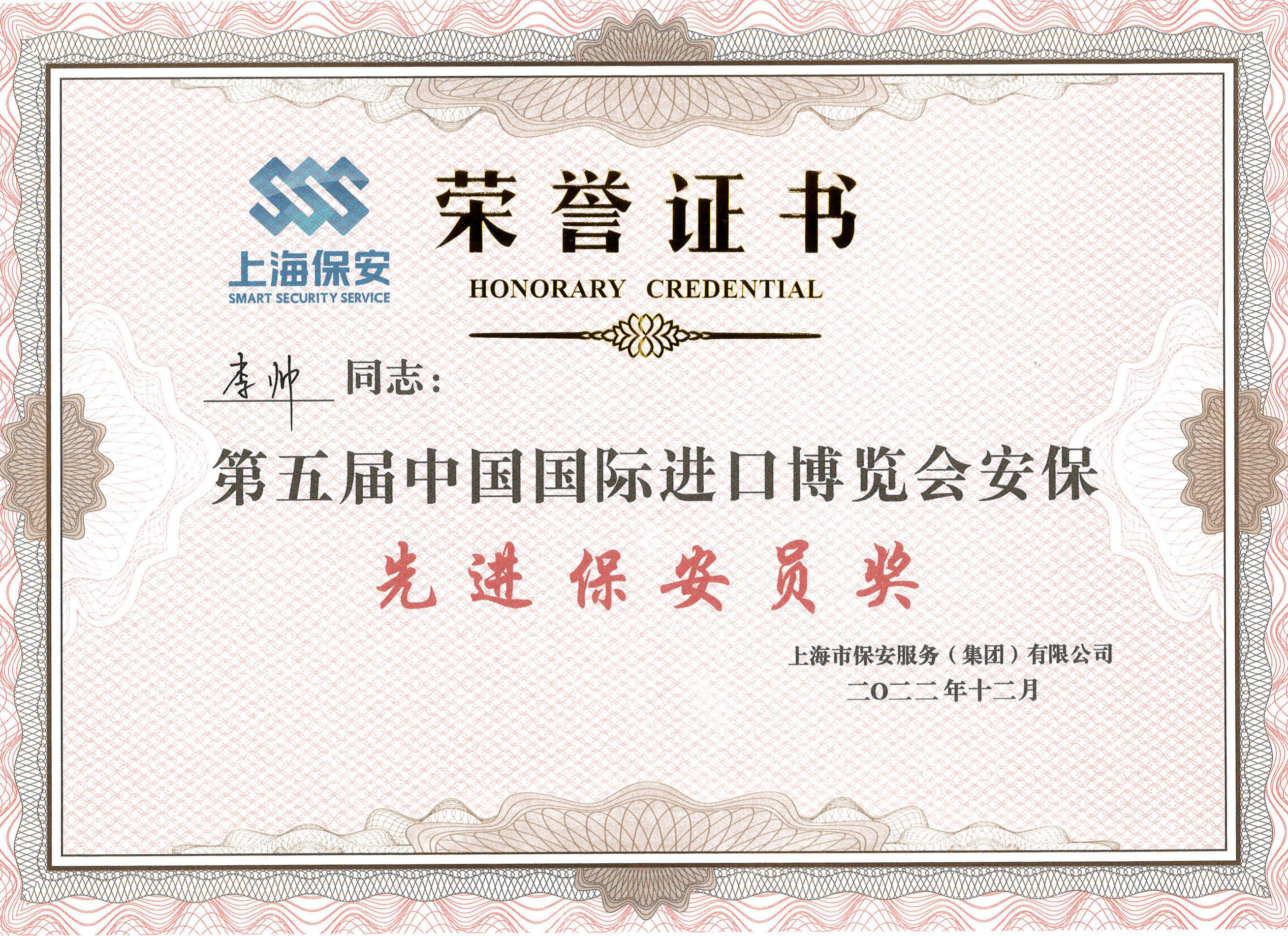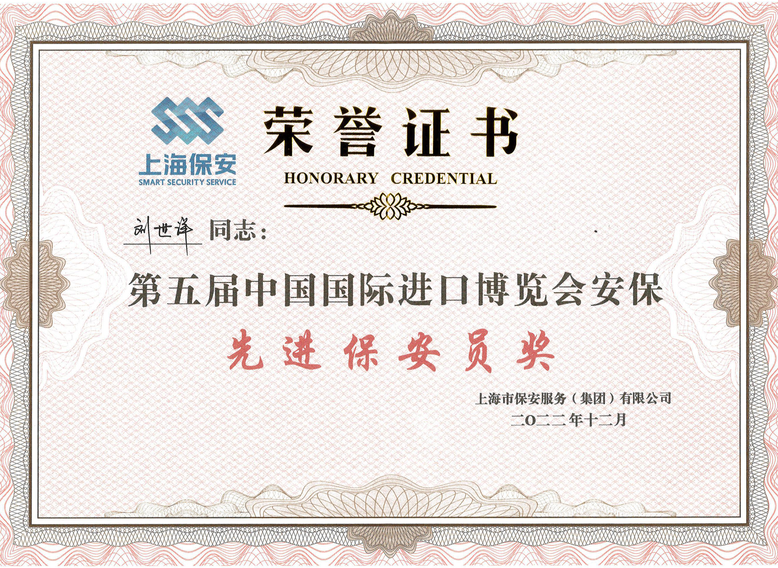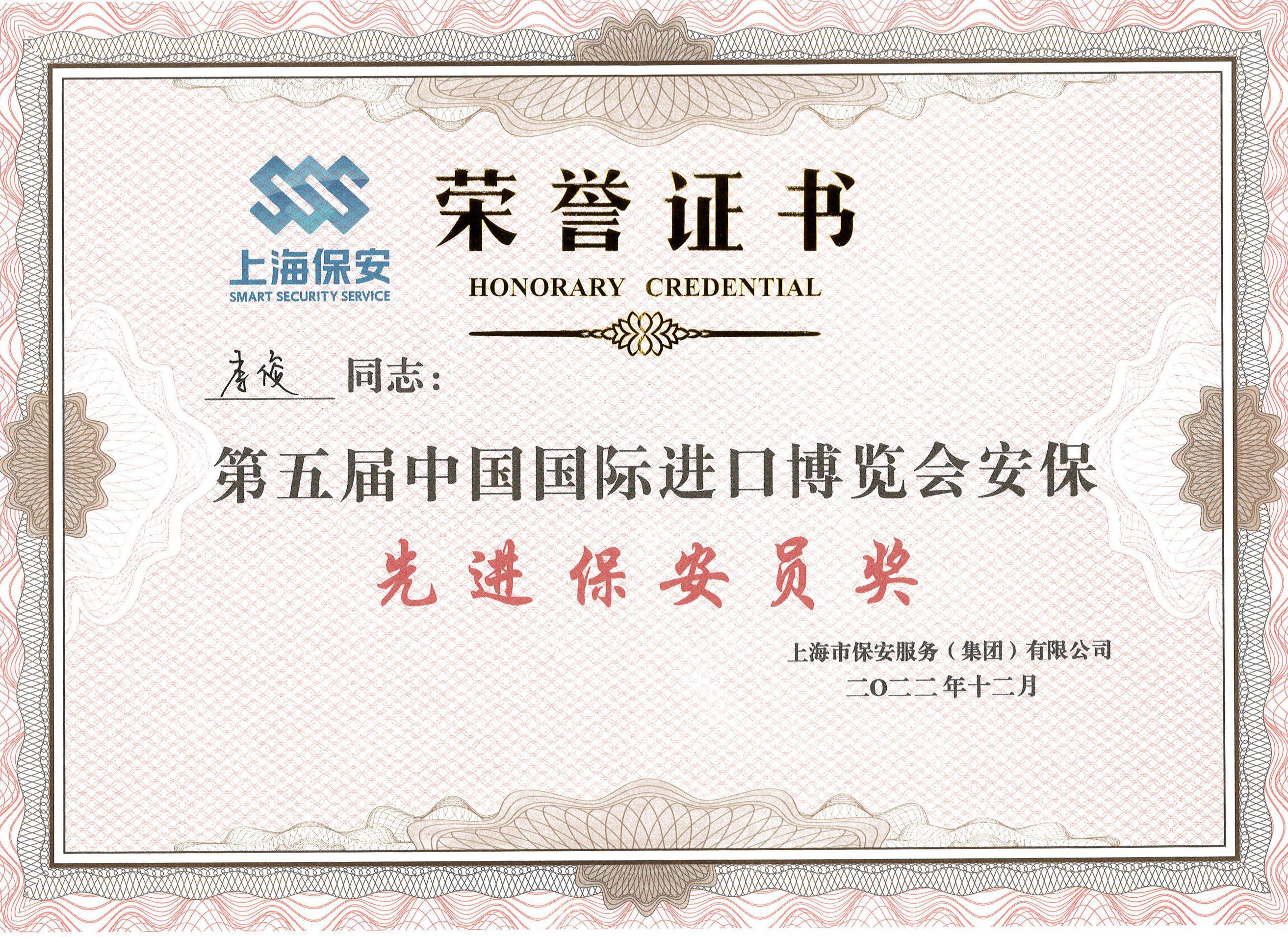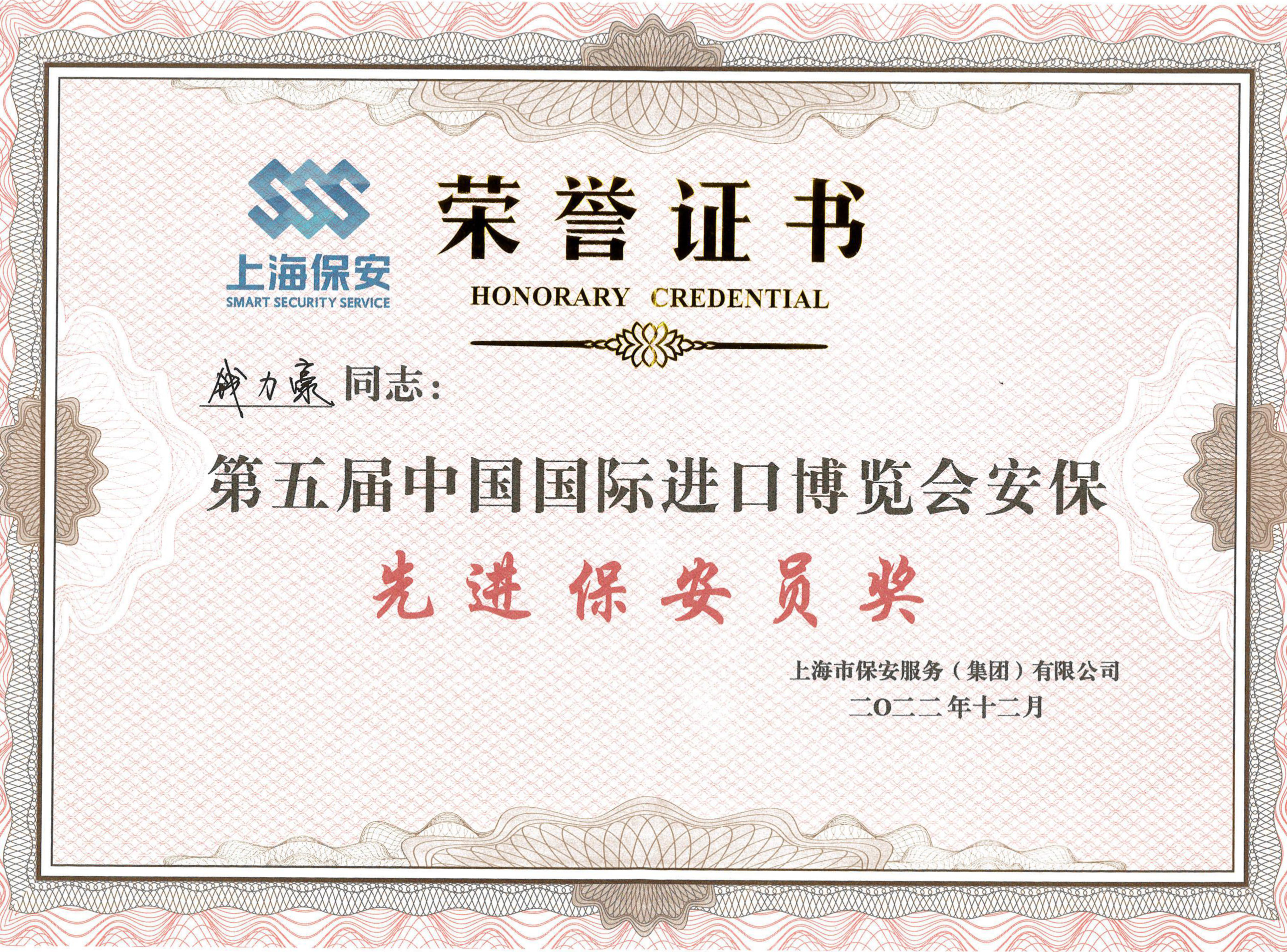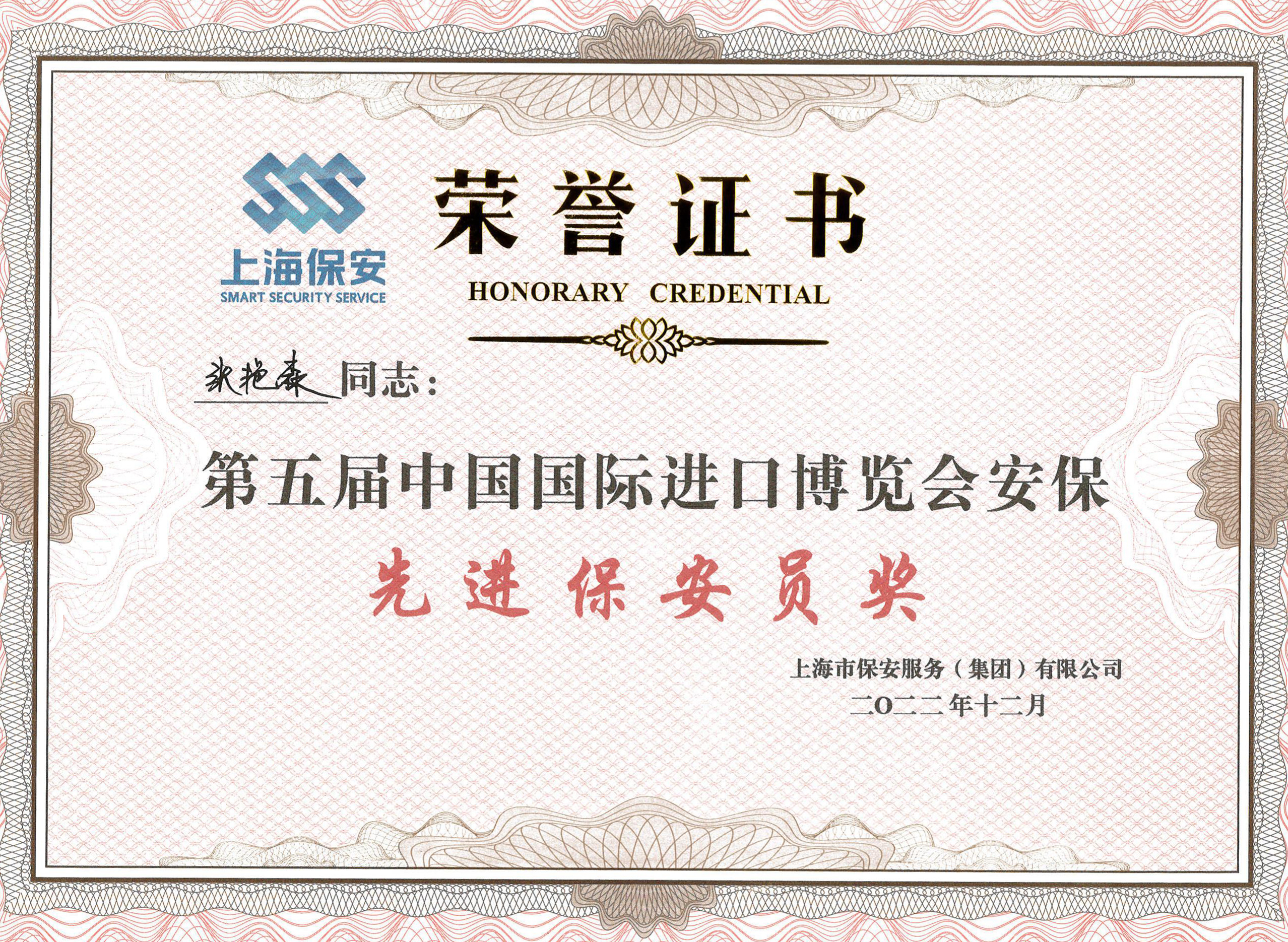 近日,上海市保安服務(wù)(集團(tuán))有限公司對參加第五屆中國國際進(jìn)口博覽會(huì)的保安員進(jìn)行了表彰。公司員工梁澤迪、錢力豪、劉世洋、宋琳、李帥、李俊、鄭光鑫和張艷森因工作表現(xiàn)突出,榮獲第五屆中國國際進(jìn)口博覽會(huì)安?!跋冗M(jìn)保安員獎(jiǎng)”。