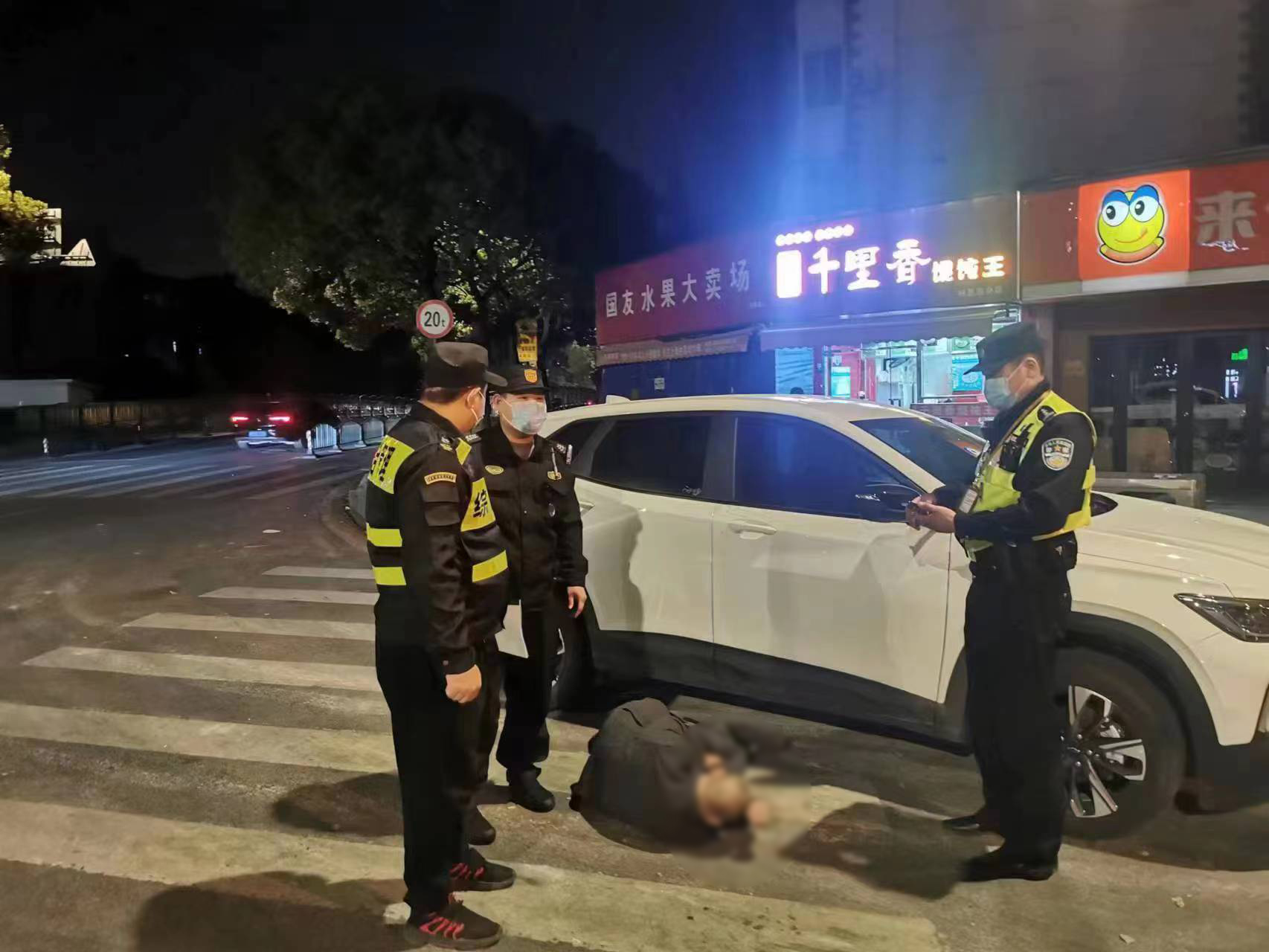 當日23:20,公司員工劉旭和胡全巡查至楊思路后長街路口時, 發(fā)現(xiàn)一位老人躺在一輛白色SUV車旁一動不動。兩人立即上前蹲下察看,老人伴有濃烈酒味,初步判斷因飲酒過量,導致昏睡不醒。