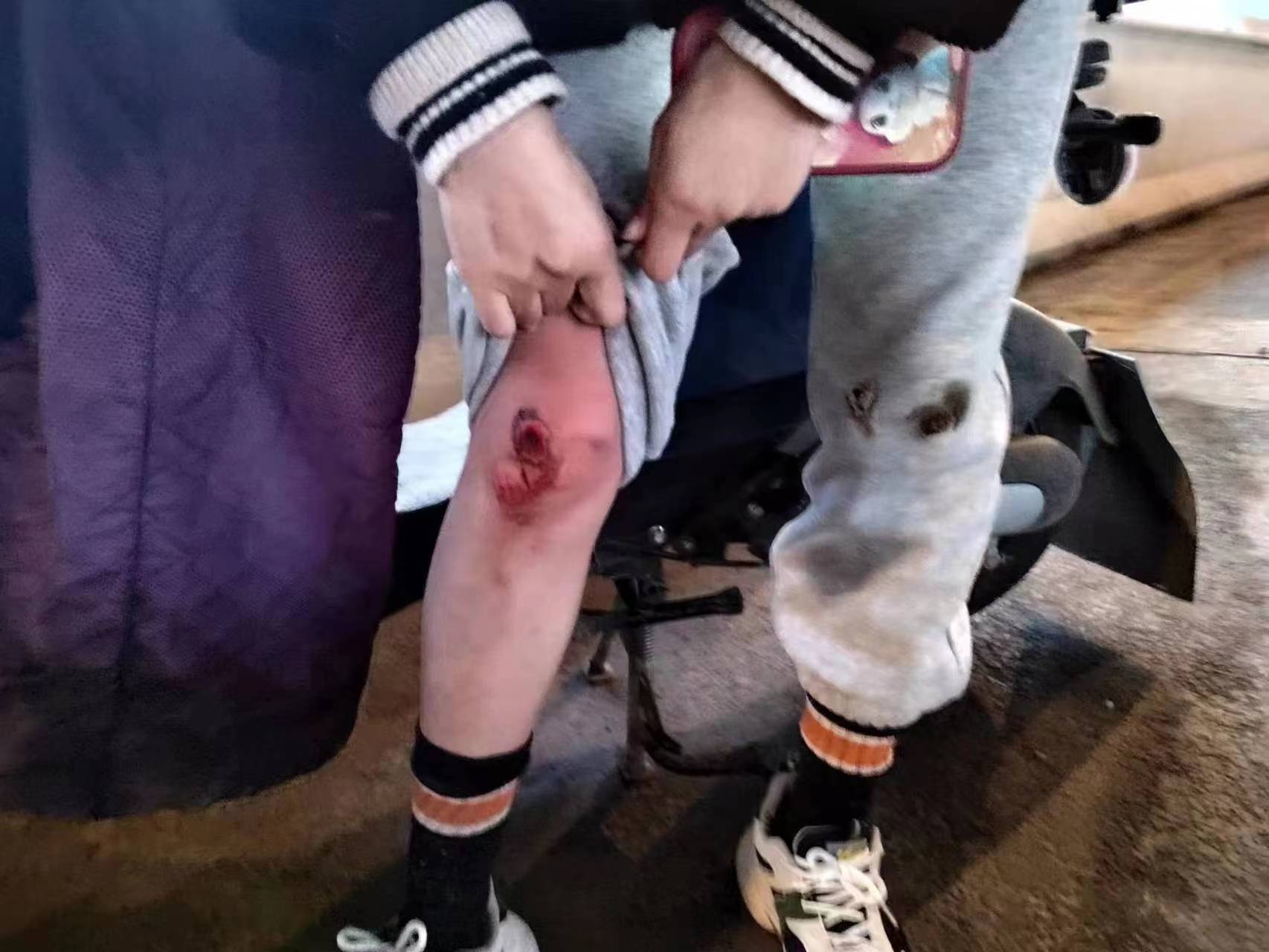 原來女子騎車時被高架橋上方掉落的水泥渣砸中,導致電動車失衡摔倒在地。女子說自己膝蓋受傷了很痛,站不起來,要叫救護車到醫(yī)院看看。