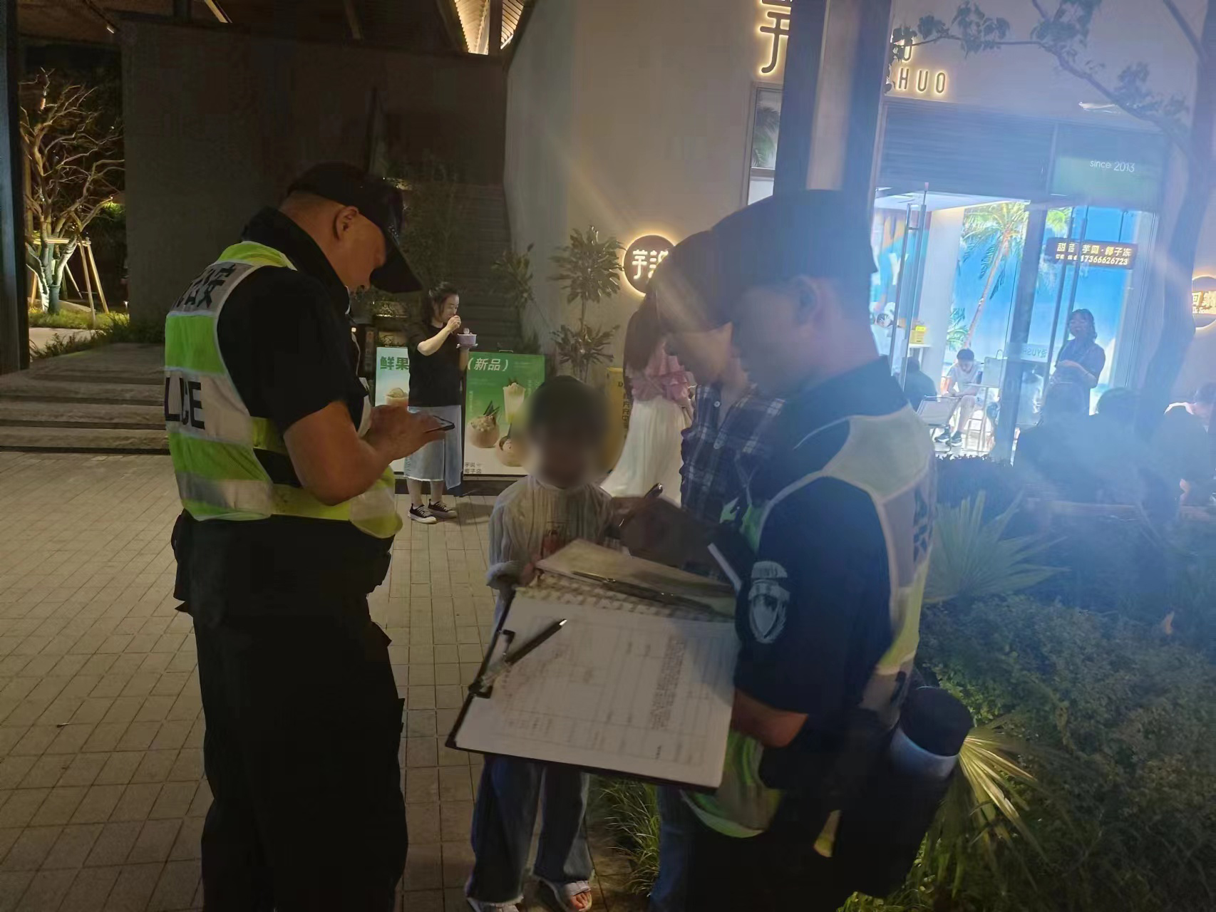 當(dāng)天20:30,公司員工徐玉強(qiáng)和牛坤在良渚街道玉鳥集巡邏時,遇到一家長求助,稱自己和孩子在玉鳥集散步,因人多一時沒照看好,孩子和自己走散了。