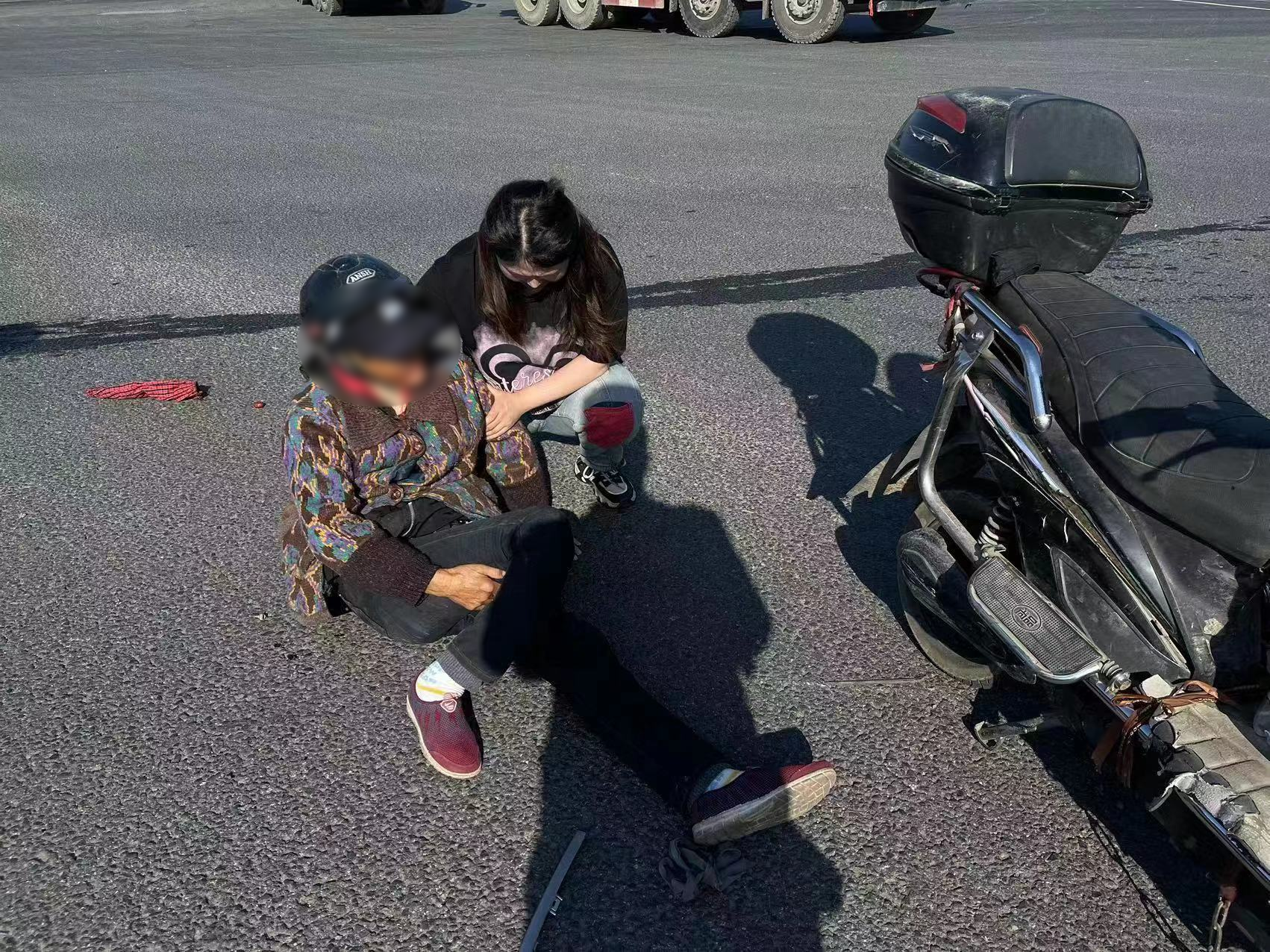 幾人見狀急忙跑過去察看,據(jù)老人講一輛小轎車右轉(zhuǎn)彎時把他們連人帶電瓶車撞倒,老奶奶左眼眶和臉部擦傷,小腿骨折無法動彈,而轎車駕駛員竟駕車而去。
