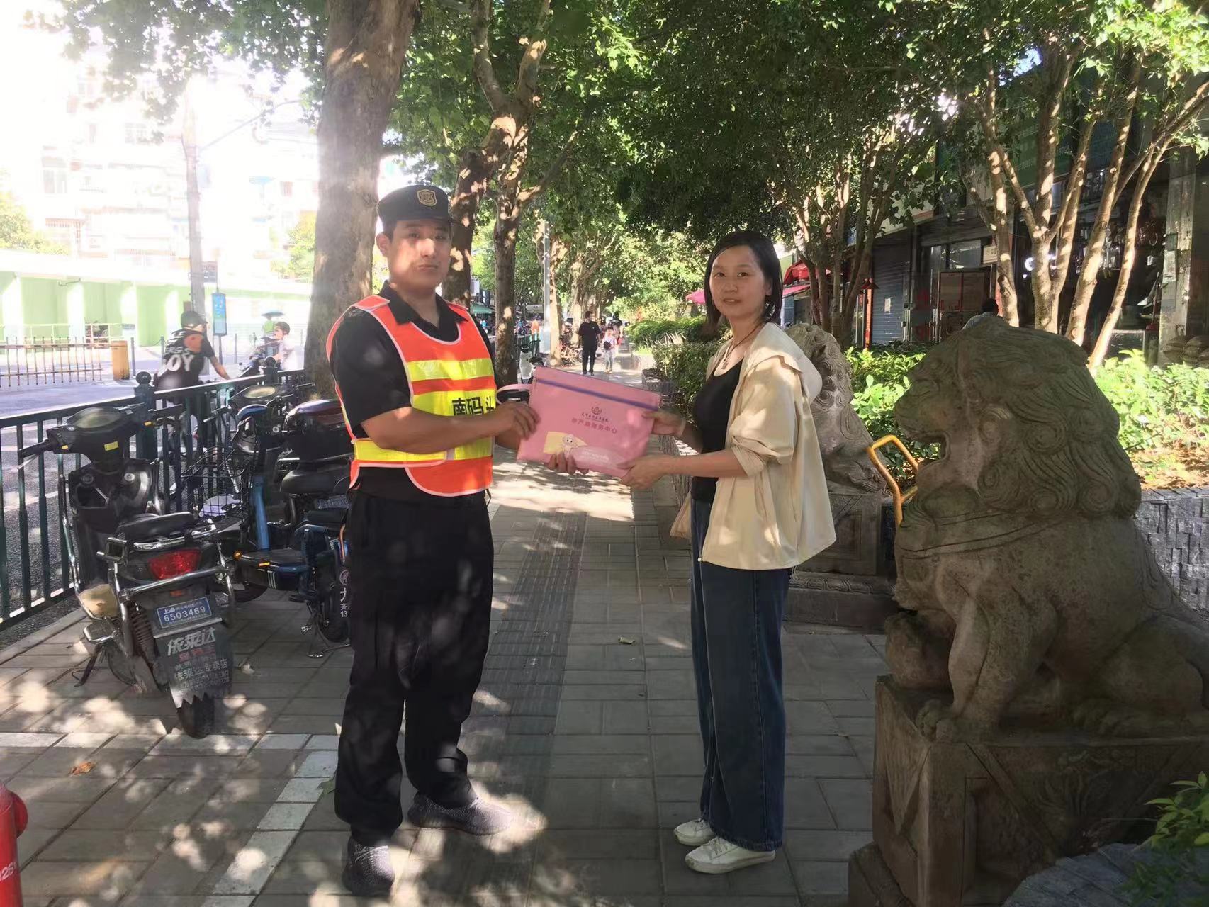 7月19日8:10,宗保公司駐浦東新區(qū)陸家嘴社區(qū)市容項目員工權(quán)小濤在南泉北路170號整理亂停放非機動車時,在一輛共享單車的車框里發(fā)現(xiàn)一臺聯(lián)想筆記本電腦??紤]到失主丟失貴重物品,可能會返回尋找,權(quán)小濤便在原地等待。大概過了10分鐘,仍無人前來認領,權(quán)小濤就將情況報告了班組長,并按指示將電腦上交城管中隊。8:40左右,一女子前來詢問仍在序化管理的權(quán)小濤,是否撿到一臺筆記本電腦,其描述的筆記本電腦品牌、外觀等信息,與權(quán)小濤撿到的電腦的特征基本一致。于是,權(quán)小濤將她帶至城管中隊,解鎖電腦開機密碼確認女子是失主后,就將電腦交還給了她。女子接過電腦,再三向宗保員工權(quán)小濤道謝。