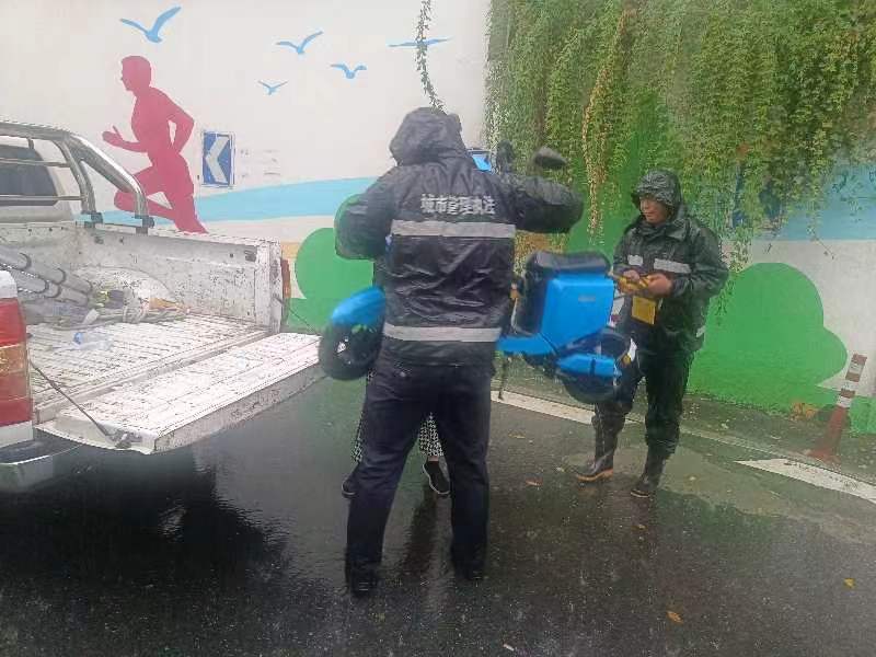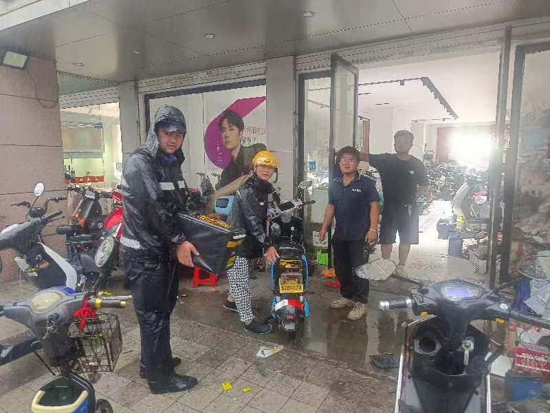 8月17日,浙江民泰駐杭州市臨平區(qū)星橋市容項目員工熱心幫助暴雨中爆胎外賣小哥。