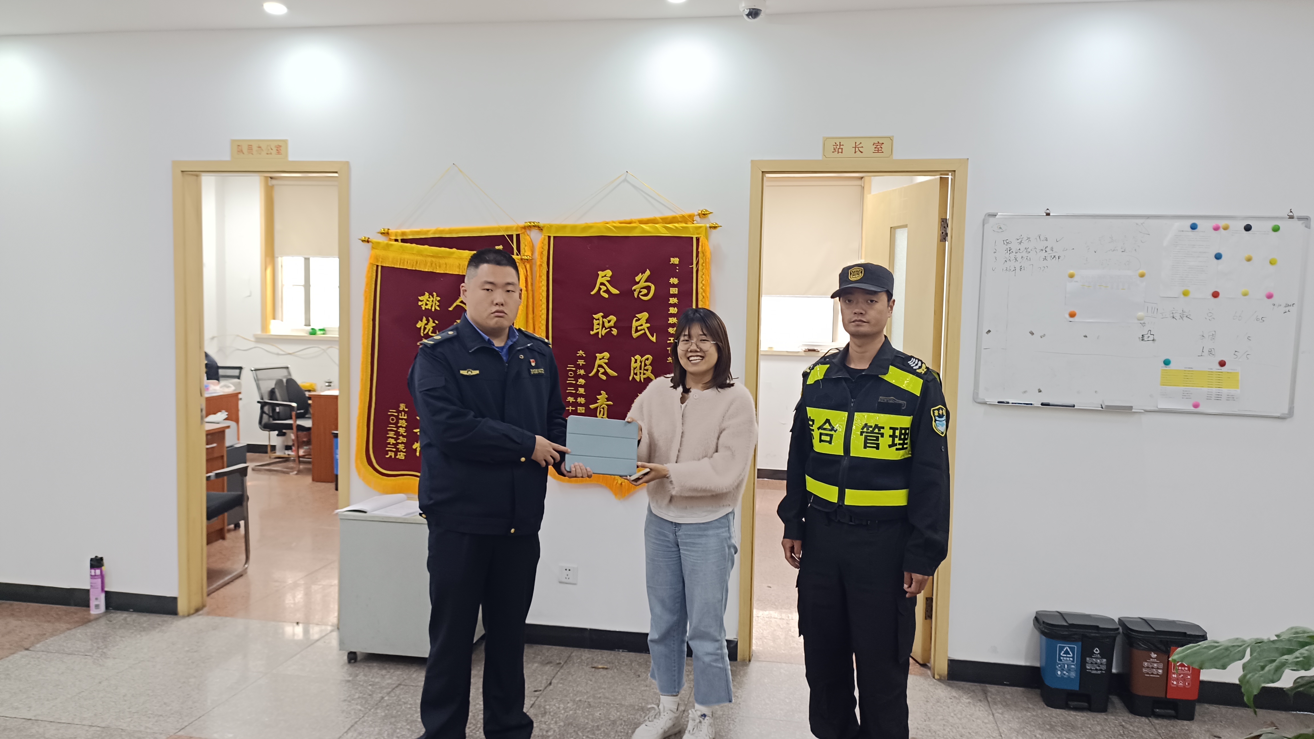 11月7日9:30,公司員工郭常杰在浦東大道720號航運大廈門口整理亂停放非機動車時,在一輛共享單車的車筐里發(fā)現(xiàn)一個華為牌平板電腦。在原地等了約15分鐘后,仍沒有人前來尋找,郭常杰便請大廈保安轉(zhuǎn)告,如果有人來找平板電腦,請其前往乳山路204號申富大廈城管中隊領(lǐng)取。11:55,一女子急急忙忙趕到申富大廈。經(jīng)核實確認(rèn)后,郭常杰將平板電腦交還給女子,當(dāng)時女子拿著電腦一再表示感謝。11月8日,該女子又特意送來一面錦旗向郭常杰表示感謝。
