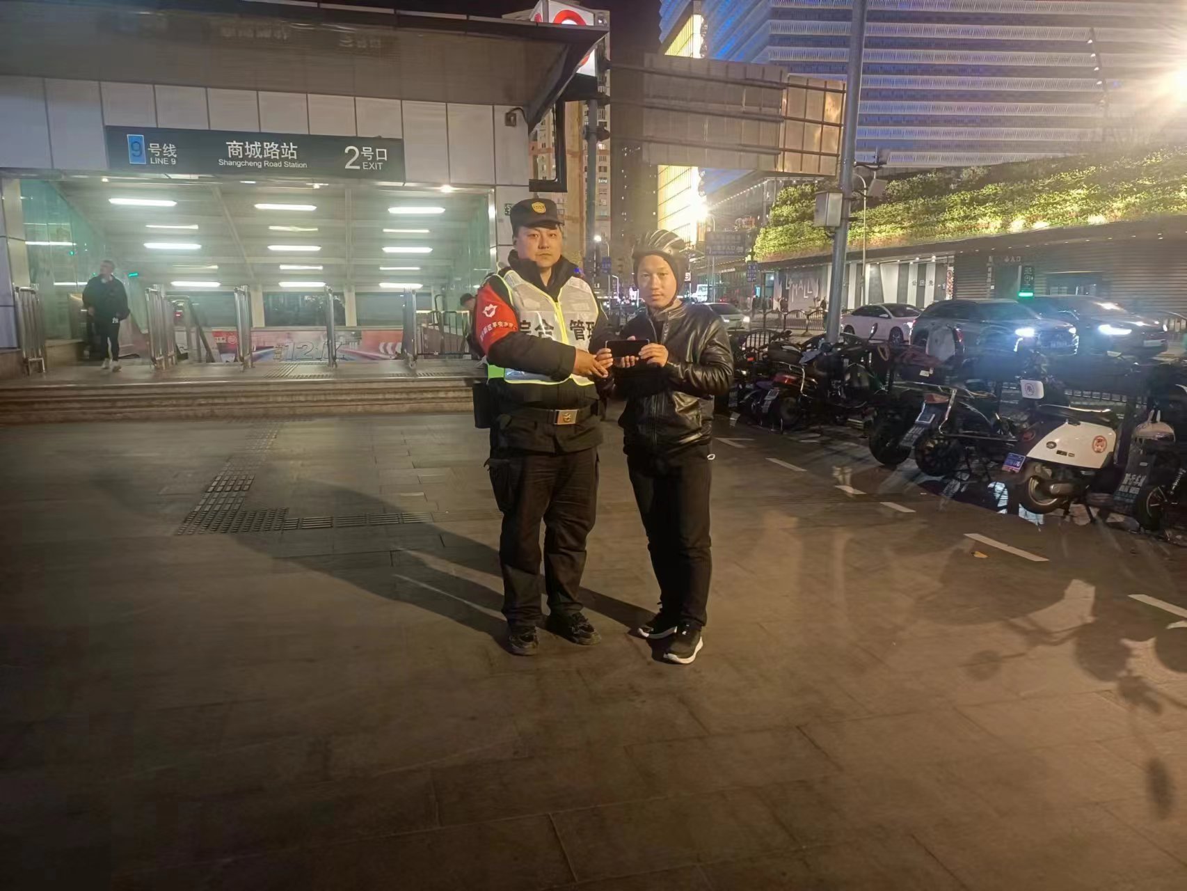 11月23日19:30,宗保公司駐浦東新區(qū)陸家嘴綜合管理項(xiàng)目員工董啟義在商城路地鐵9號(hào)線2號(hào)口附近值勤時(shí),撿到一部華為手機(jī)。董啟義想失主丟了手機(jī),可能會(huì)返回尋找,就留在原地等待。過了十幾分鐘,一男子打來電話尋找手機(jī),董啟義了解了相關(guān)信息后,便與男子約定好碰面地點(diǎn)。很快,一位戴著頭盔的男子趕到約定地點(diǎn)。通過人臉識(shí)別成功解鎖鎖屏密碼后,董啟義就將手機(jī)交還給了他。男子拿著手機(jī),連連向宗保員工董啟義道謝。