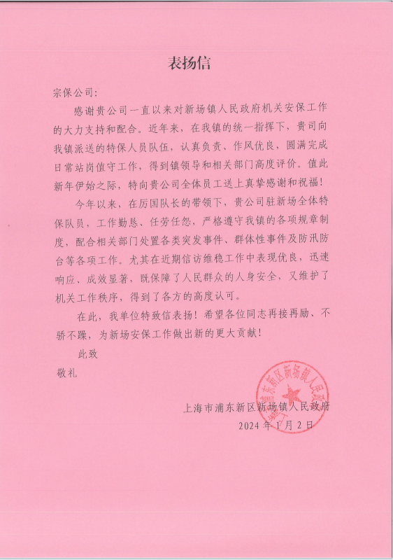 1月2日,宗保公司駐浦東新區(qū)新場(chǎng)鎮(zhèn)人民政府輔助項(xiàng)目收到鎮(zhèn)政府的表揚(yáng)信,表揚(yáng)項(xiàng)目隊(duì)長(zhǎng)厲國(guó),愛崗敬業(yè)、任勞任怨,素質(zhì)過硬、責(zé)任心強(qiáng),團(tuán)結(jié)帶領(lǐng)項(xiàng)目員工嚴(yán)格遵守鎮(zhèn)政府管理規(guī)定,全力配合鎮(zhèn)相關(guān)部門做好秩序維護(hù)工作善作善為的精神。
