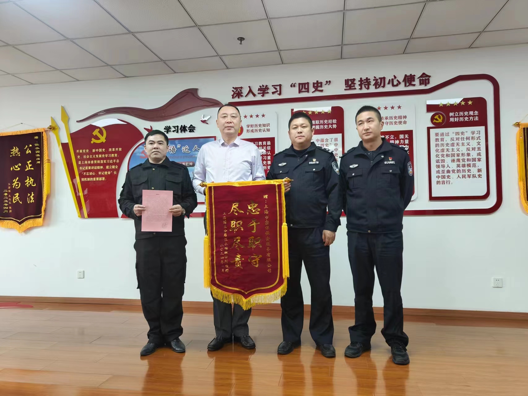 1月10日,浦東新區(qū)公安分局依水園派出所教導(dǎo)員薛春華將一面繡有“忠于職守 盡職盡責(zé)”的錦旗和一封感謝信送到宗保公司董事長(zhǎng)王耀的手中,贊揚(yáng)公司駐依水園派出所項(xiàng)目員工擔(dān)當(dāng)作為、熱忱服務(wù),機(jī)警靈活、規(guī)范專業(yè)的優(yōu)異表現(xiàn),表揚(yáng)項(xiàng)目負(fù)責(zé)人宮建華認(rèn)真負(fù)責(zé)、嚴(yán)謹(jǐn)細(xì)致的工作態(tài)度和敬業(yè)精神。