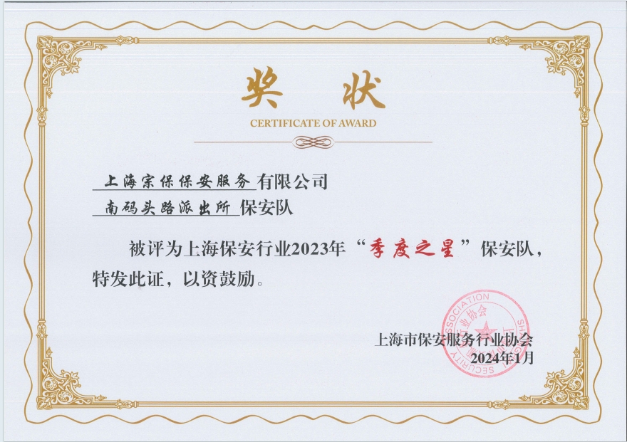 公司浦東新區(qū)公安分局南碼頭派出所保安隊被評為2023年“季度之星”保安隊