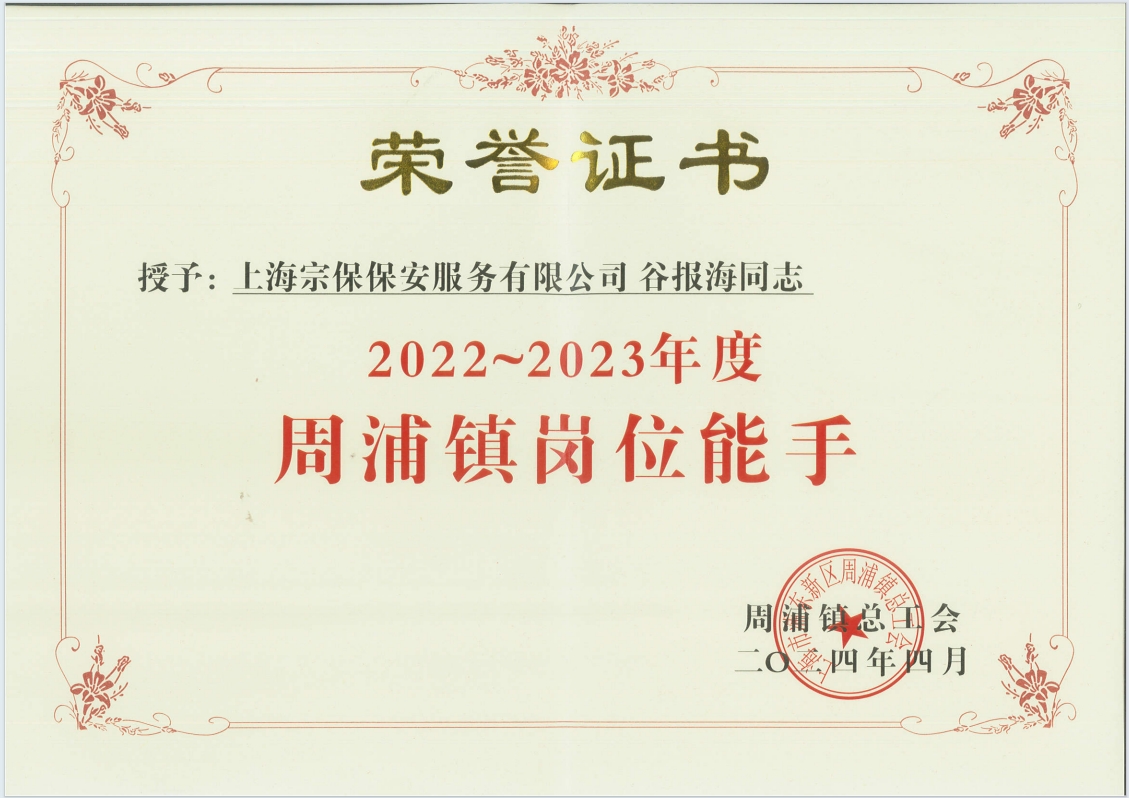 公司員工谷報海榮獲2022—2023年度周浦鎮(zhèn)崗位能手稱號