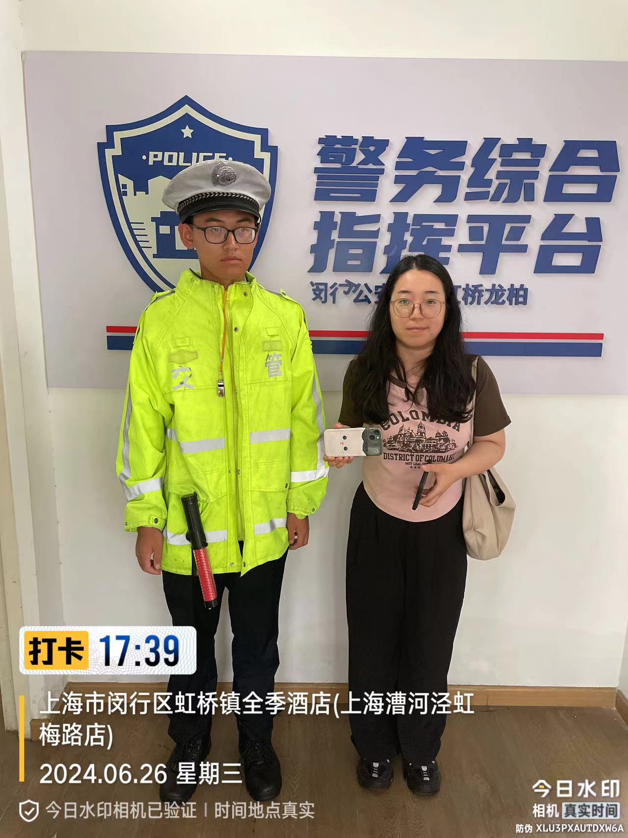6月26日15:09,宗保公司駐閔行區(qū)虹橋交管輔助項目員工李業(yè)兵在吳中路虹許路路口執(zhí)勤時,撿到一部蘋果手機,詢問周圍路人無人認領(lǐng)后,將情況報告了項目隊長。過了一會兒,一位女士打來電話尋找手機,李業(yè)兵問了問情況,便與她約好在交警崗?fù)づ雒妗?7:39,一位身穿短T的女士來到交通崗?fù)?。李業(yè)兵核實確認女士是失主后,就把手機交還給了她。女士拿著手機十分高興,連連向李業(yè)兵道謝。