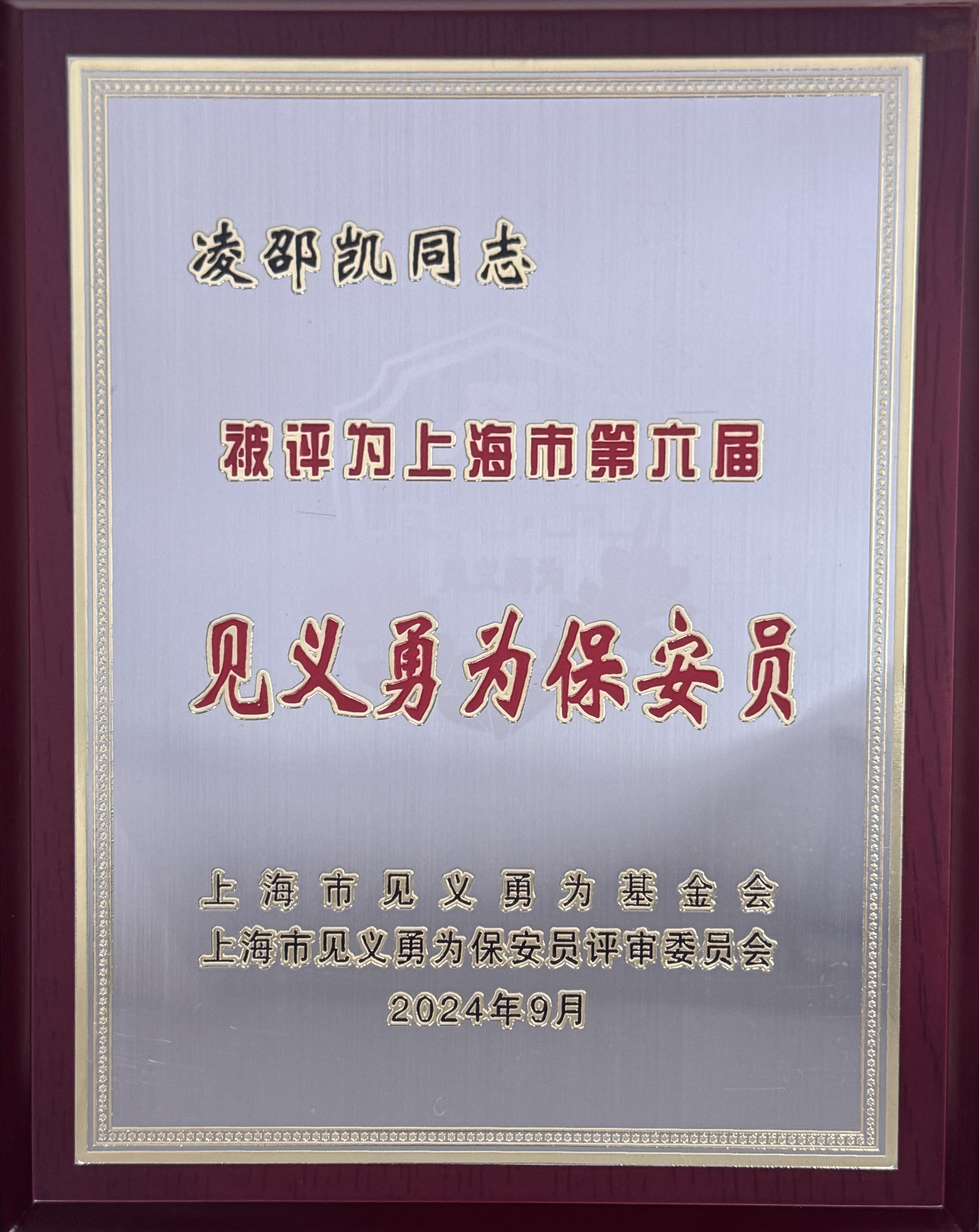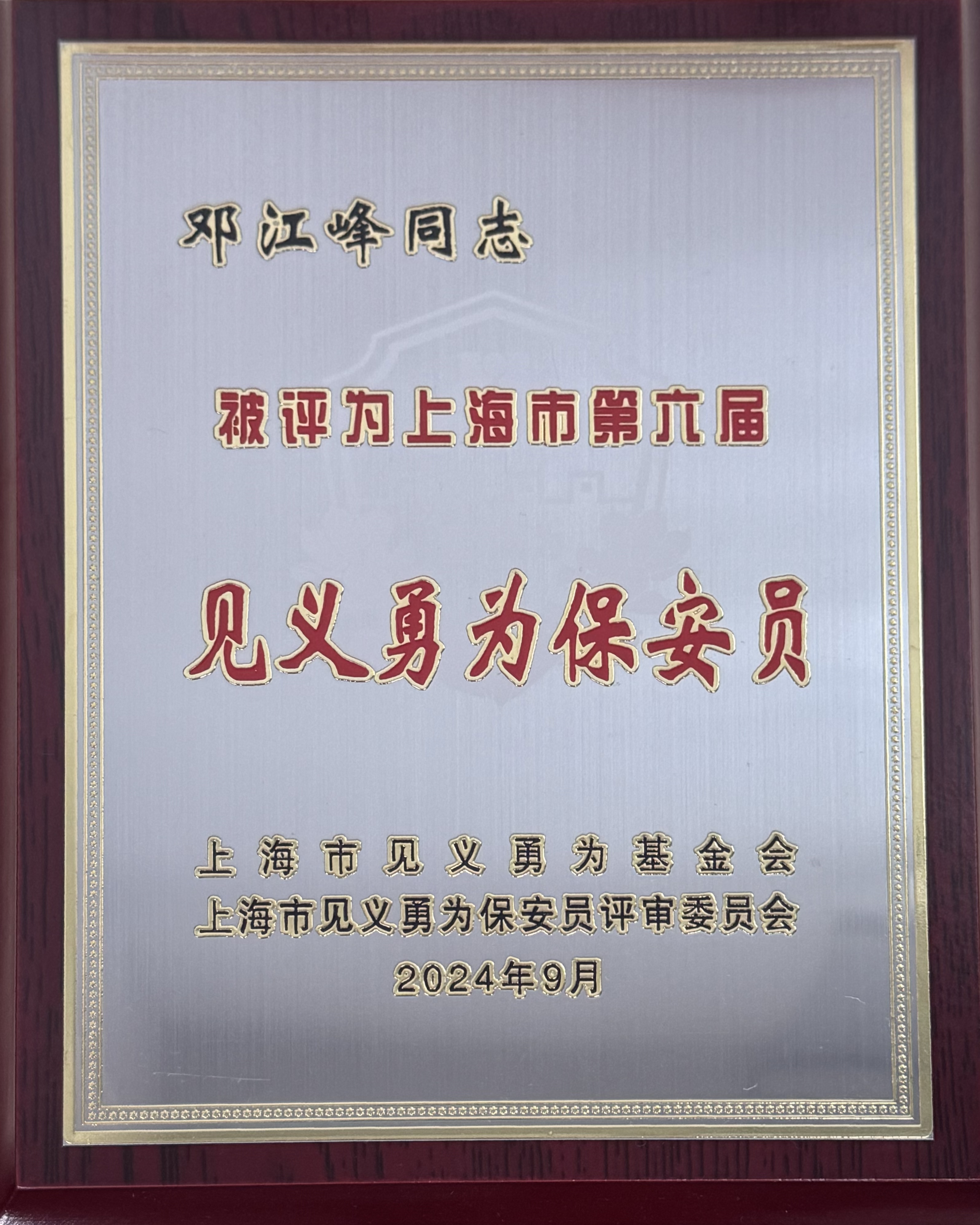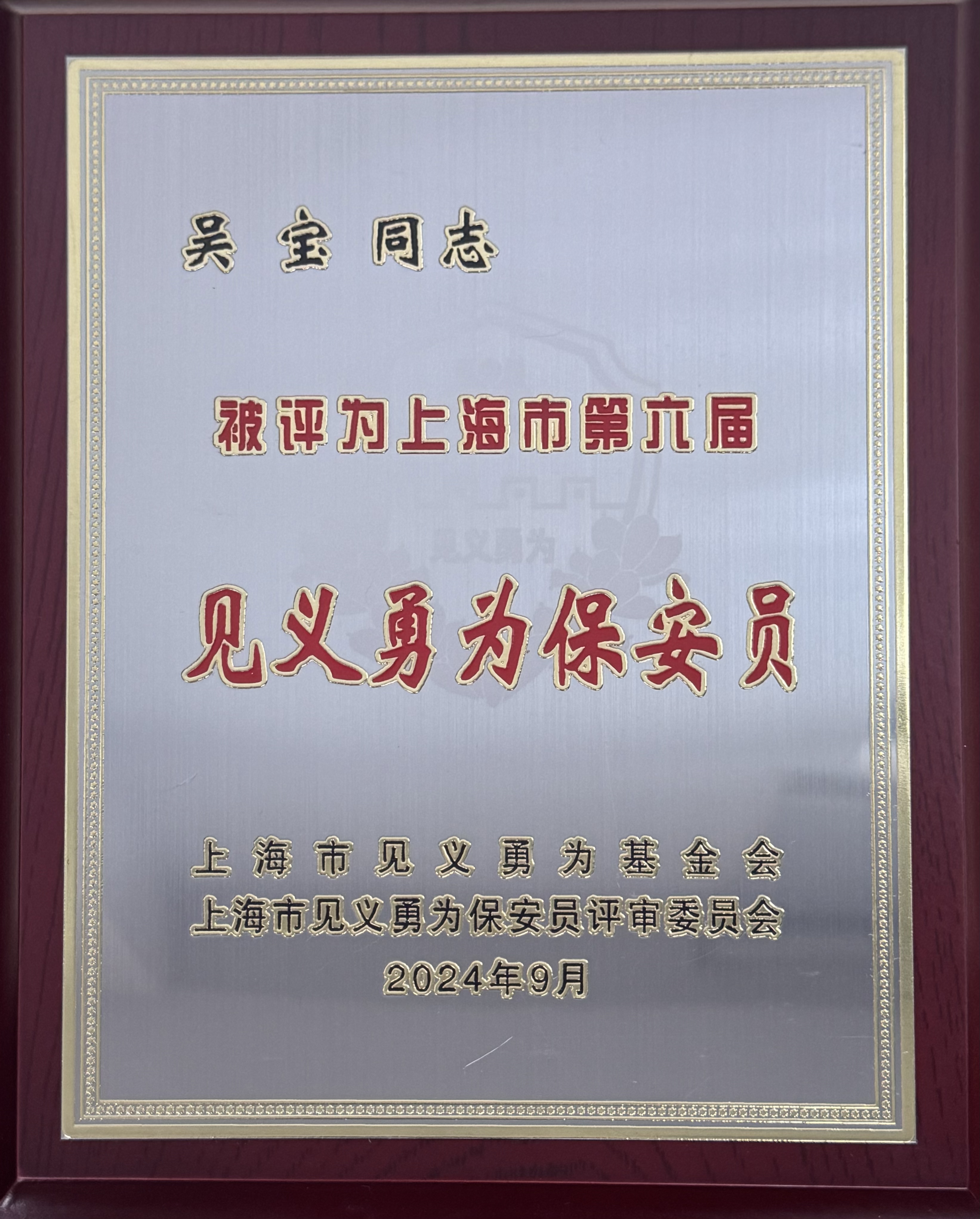 2024年9月27日,上海市見義勇為基金會(huì)在上海市司法局三樓會(huì)議室召開2024年二三季度見義勇為先進(jìn)評(píng)選表彰發(fā)布會(huì)。會(huì)上,上海宗保保安服務(wù)有限公司員工管旭峰、凌邵凱、吳寶和鄧江峰被評(píng)為上海市第六屆“見義勇為保安員”。