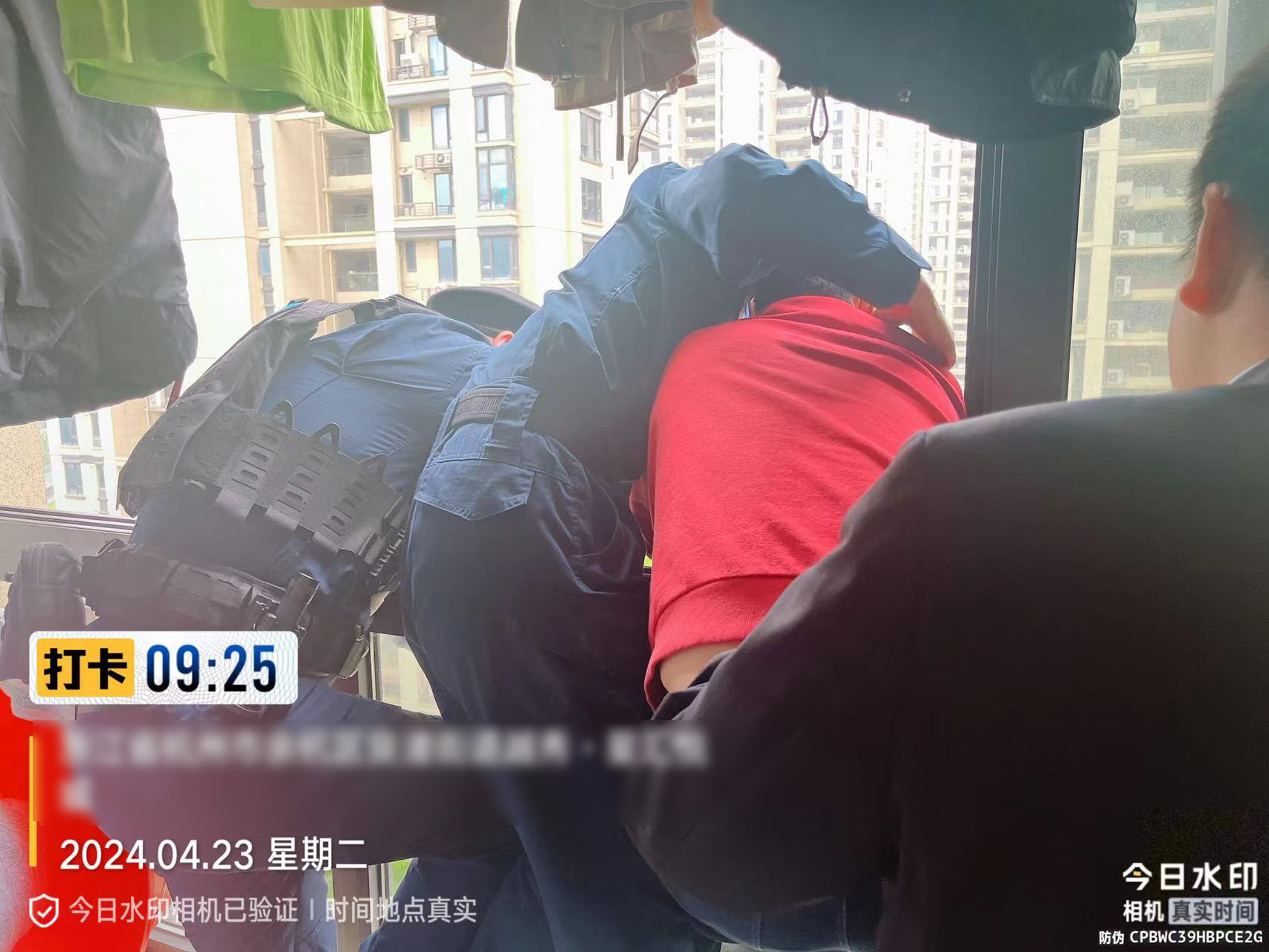 4月23日9時(shí)許,杭州市余杭區(qū)良渚新城派出所接到群眾報(bào)警,稱家住某小區(qū)12樓的一女子欲跳樓輕生。接警后,派出所立即指令正在附近執(zhí)勤的派出所勤務(wù)隊(duì)員李梟琦和民泰公司員工凌邵凱前往現(xiàn)場(chǎng)處置。