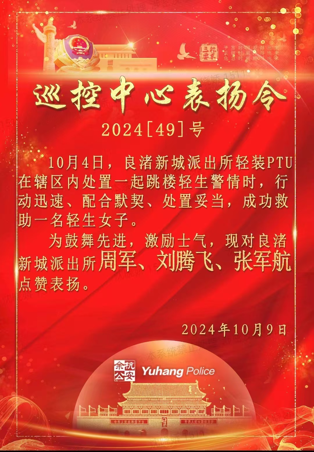 女子后續(xù)交由趕到現(xiàn)場的民警進行處理。事后,民泰公司員工劉騰飛和張軍航不顧個人安危、跨過頂樓護欄救下輕生女子的行為得到了余杭區(qū)公安分局巡控中心的通報表揚。