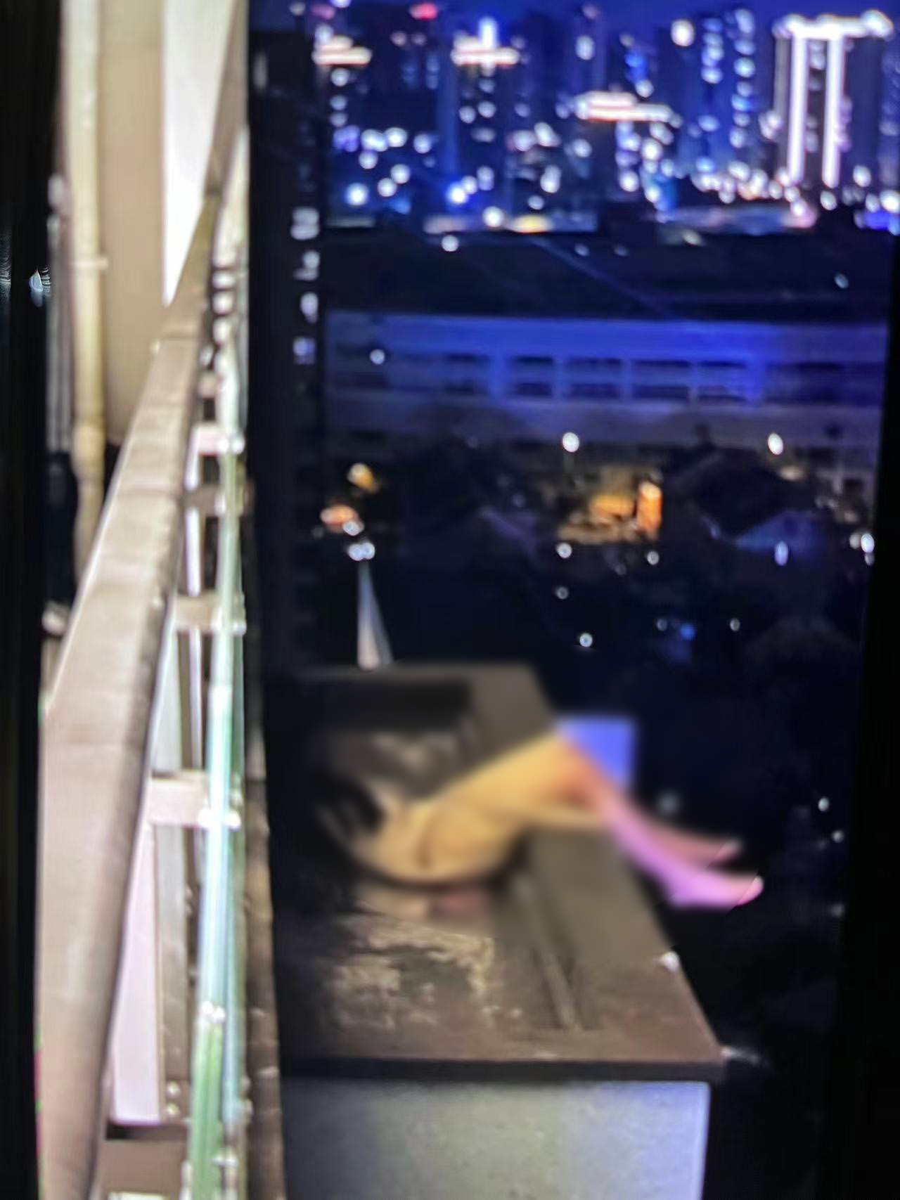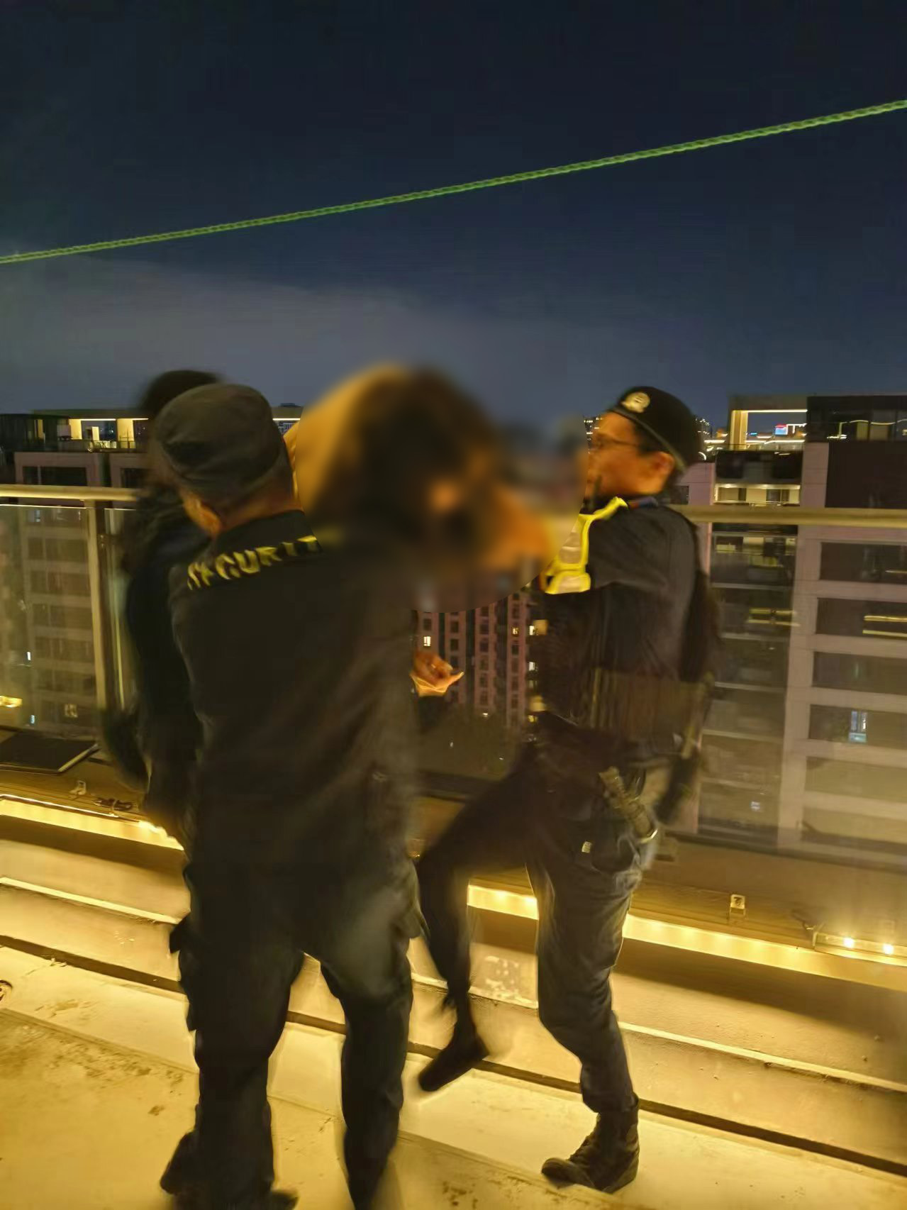 3人快速來到事發(fā)小區(qū),疾奔到樓頂。此時,該名女子雙腿懸空坐在護欄外的露臺處,被小區(qū)保安緊緊地拉著。