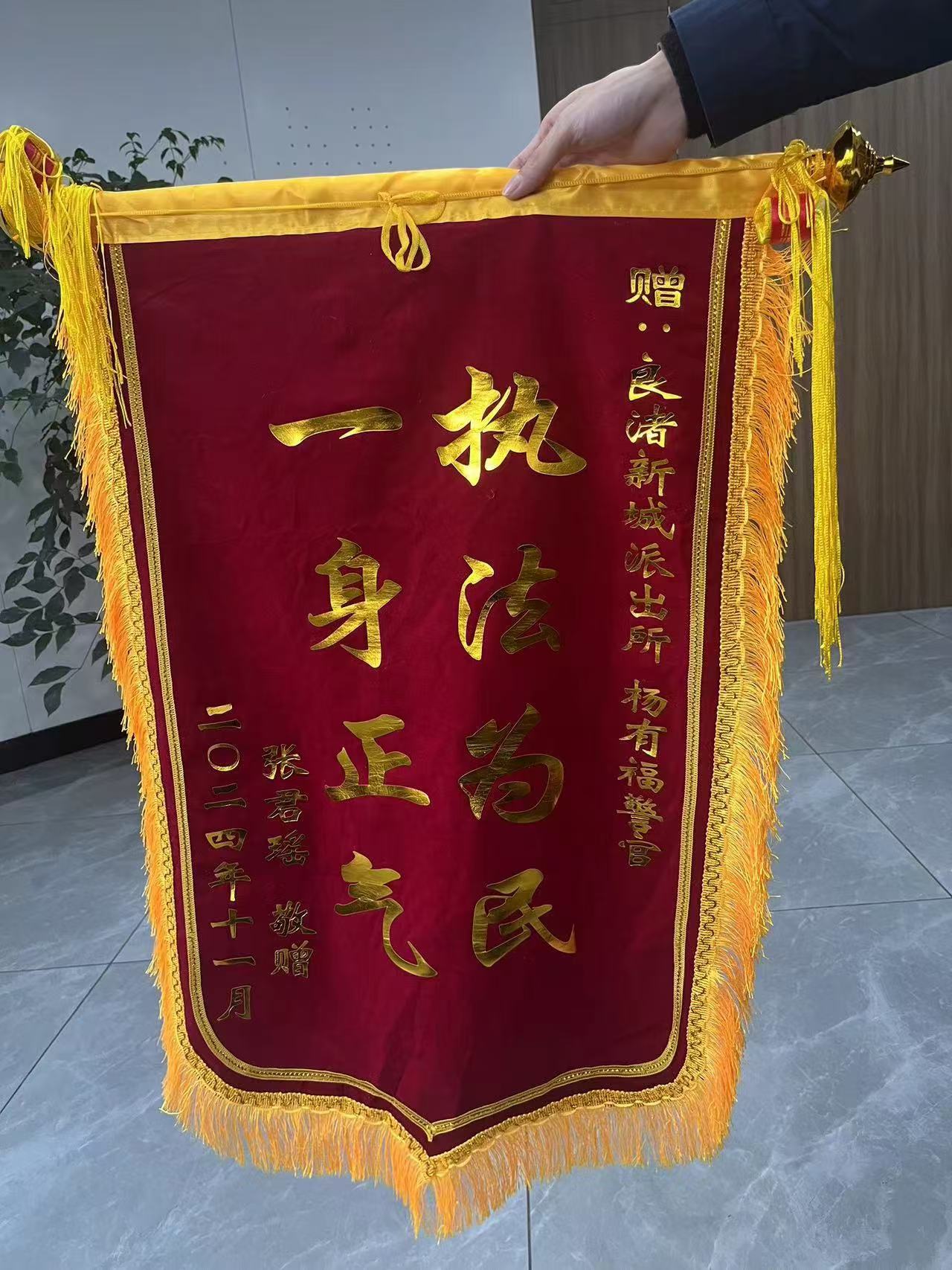 過(guò)了兩個(gè)多小時(shí),一男一女兩位年輕人來(lái)到派出所,將手機(jī)交至張女士手中。張女士拿著失而復(fù)得的手機(jī)十分激動(dòng),連聲道謝。11月22日7:00,張女士將一面繡有“一身正氣 執(zhí)法為民”的錦旗送至良渚新城派出所,再次誠(chéng)摯感謝幫她找回手機(jī)。