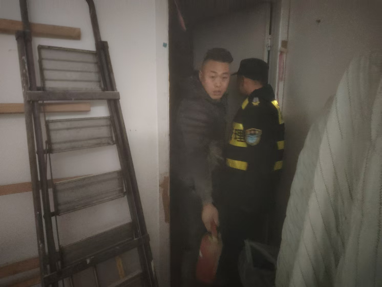 接著,兩人又趕緊向附近商戶借來(lái)滅火器,與一商戶老板一道快速?zèng)_上樓滅火。他們相互配合、接力撲救,十幾分鐘后成功將明火撲滅,遏制了火勢(shì)蔓延,避免了財(cái)產(chǎn)更大損失。