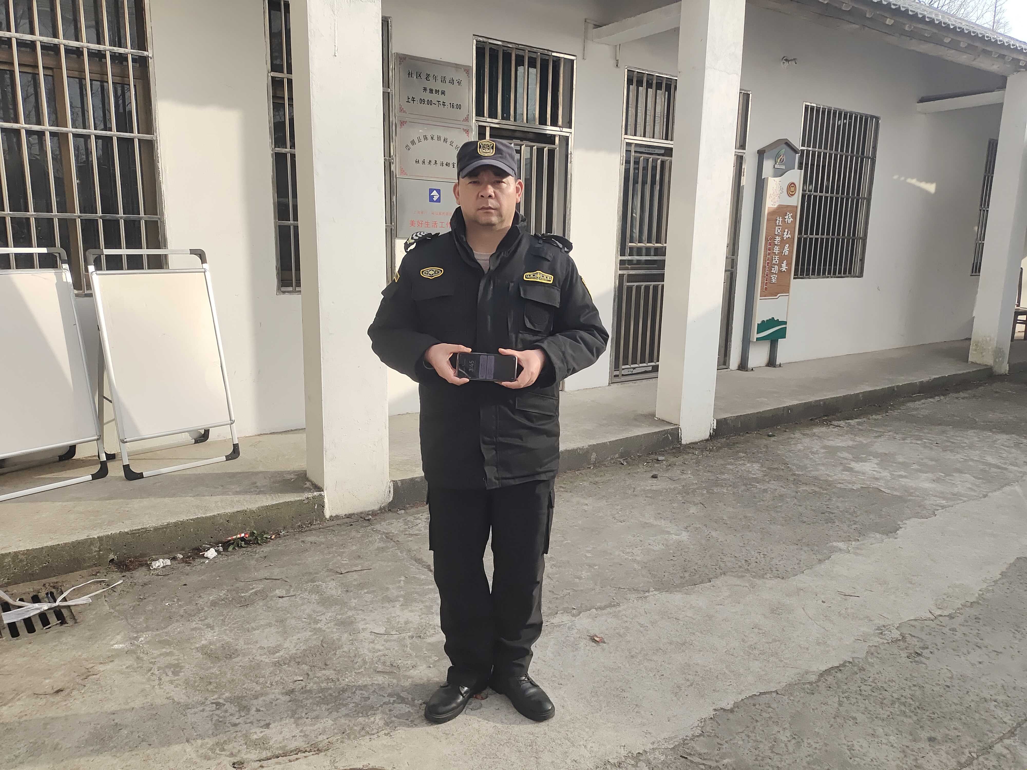 大概15分鐘后,正在值勤的周會(huì)達(dá)聽聞一小伙子在焦急地尋找手機(jī),便主動(dòng)上前詢問。當(dāng)其發(fā)現(xiàn)小伙子描述的手機(jī)特征與他撿到的手機(jī)高度吻合時(shí),便立即帶著小伙子前往保安亭領(lǐng)取。