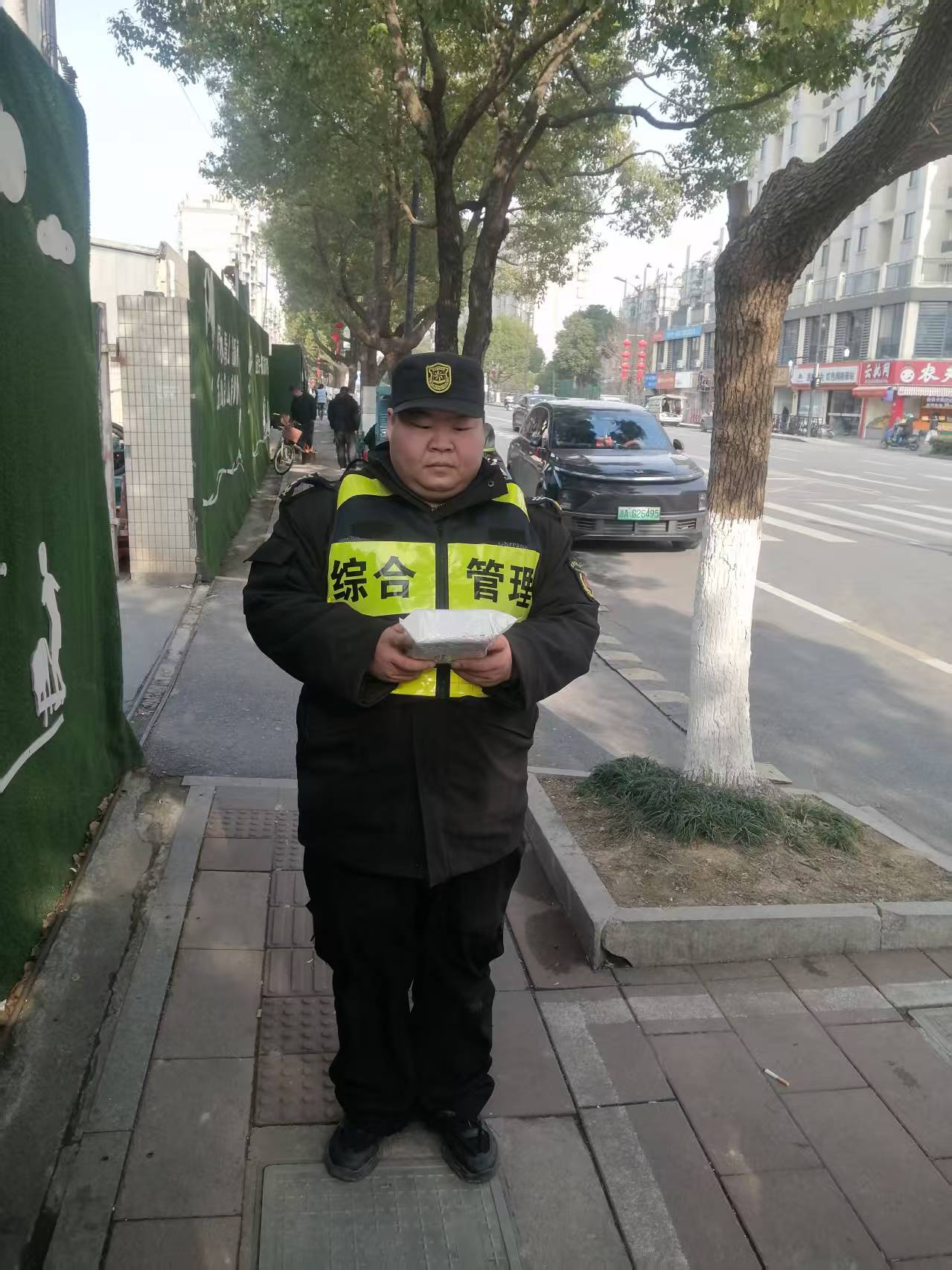 2月26日15:40,浙江民泰公司駐杭州市余杭區(qū)五常街道市容項目員工周成成在五常街道同順街巡查時,撿到一個未拆封的快遞,報告帶班組長后,便按指示在原地等待失主。