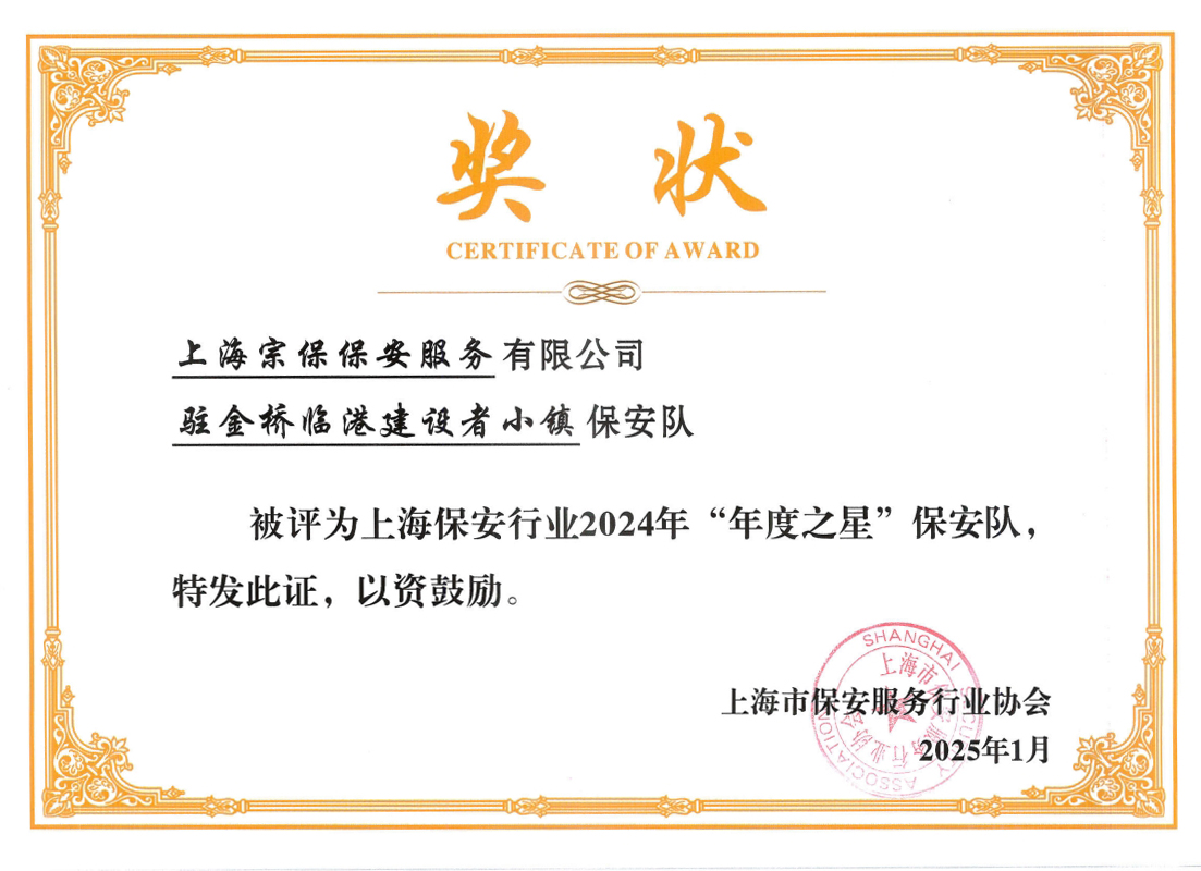 公司駐金橋臨港建設者小鎮(zhèn)保安隊被評為“年度之星”保安隊