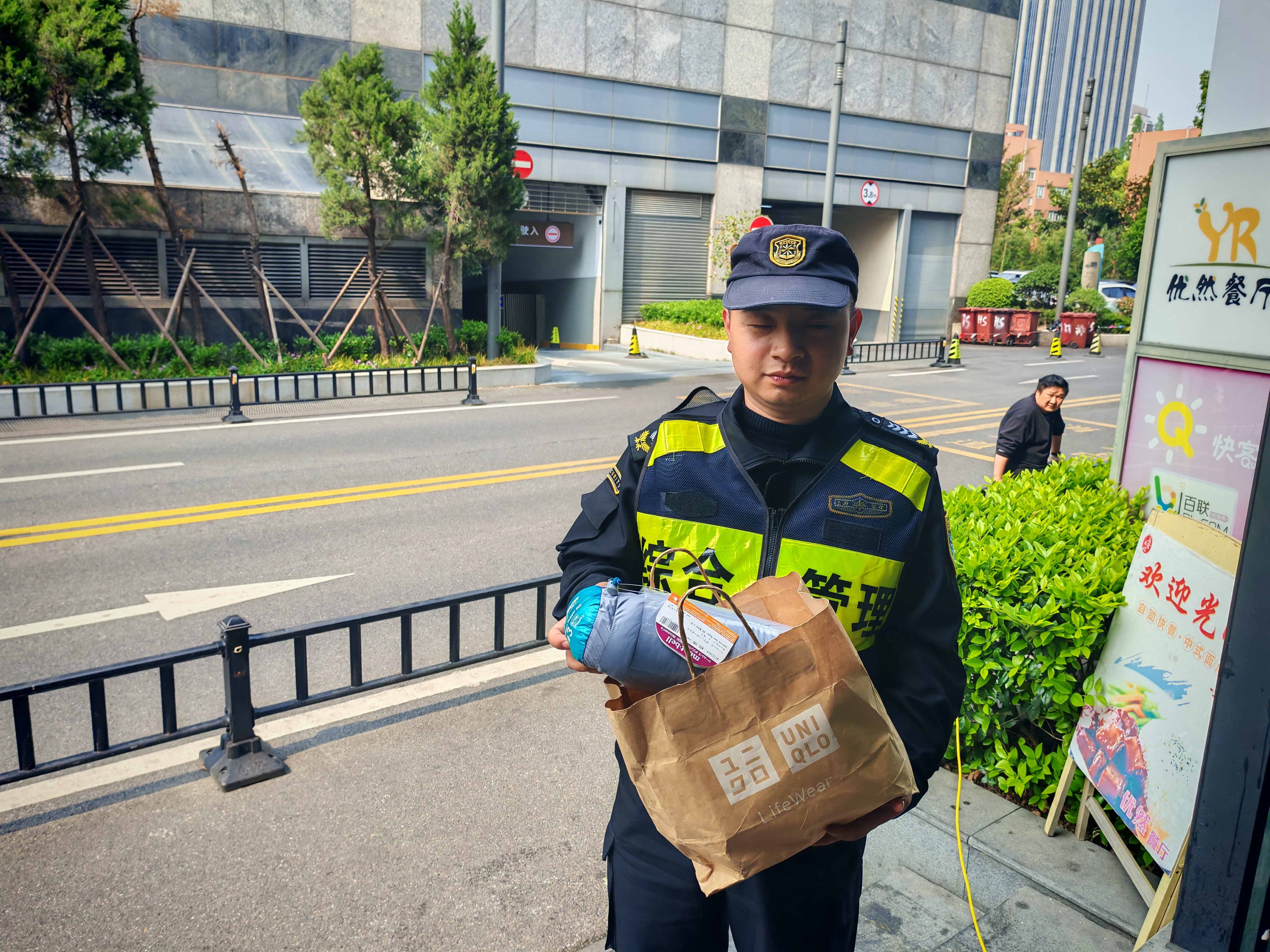 4月23日11:30,宗保公司駐浦東新區(qū)陸家嘴社區(qū)市容項(xiàng)目員工趙志龍?jiān)诟I铰泛竭\(yùn)大廈整理共享單車時(shí),發(fā)現(xiàn)一車筐里有個(gè)優(yōu)衣庫紙袋,內(nèi)有一個(gè)睡袋。