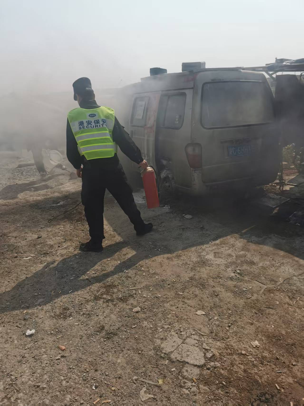 當(dāng)日上午9時(shí)許,正在一期生活區(qū)門崗執(zhí)勤的員工王海全發(fā)現(xiàn)馬路對(duì)面空地上停放的面包車突然冒出濃濃黑煙,情況十分危急。王海全意識(shí)到事態(tài)嚴(yán)重,立即向當(dāng)班組長(zhǎng)王志毫報(bào)告,并迅速抄起滅火器沖向起火地點(diǎn)。接到報(bào)告后,王志毫立刻安排巡邏崗員工孫亮亮前往支援。