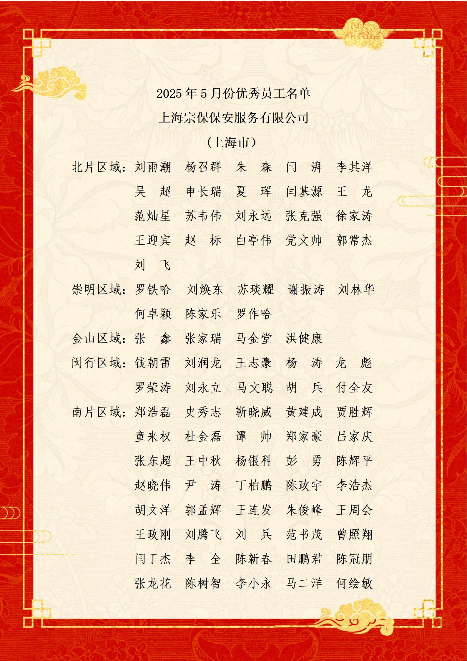 5月份,公司廣大員工根據(jù)甲方的任務(wù)要求,按照公司的部署安排,認(rèn)真踐行公司“誠(chéng)信為本 服務(wù)至上”的經(jīng)營(yíng)理念,甘于擔(dān)當(dāng)、善于作為,助力完成了2025HADO世冠杯暨波動(dòng)虛擬運(yùn)動(dòng)嘉年華安保任務(wù),全力配合甲方做好了城市管理輔助、治安巡邏聯(lián)防、物業(yè)服務(wù)保障、生態(tài)環(huán)境保護(hù)、高鐵線路巡防、社區(qū)消防應(yīng)急等工作。期間,涌現(xiàn)出了一批盡心履責(zé)、崗位建功、拾金不昧、熱心助人的優(yōu)秀員工和先進(jìn)典型。
