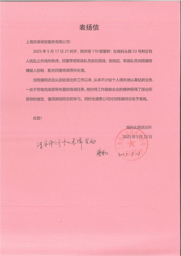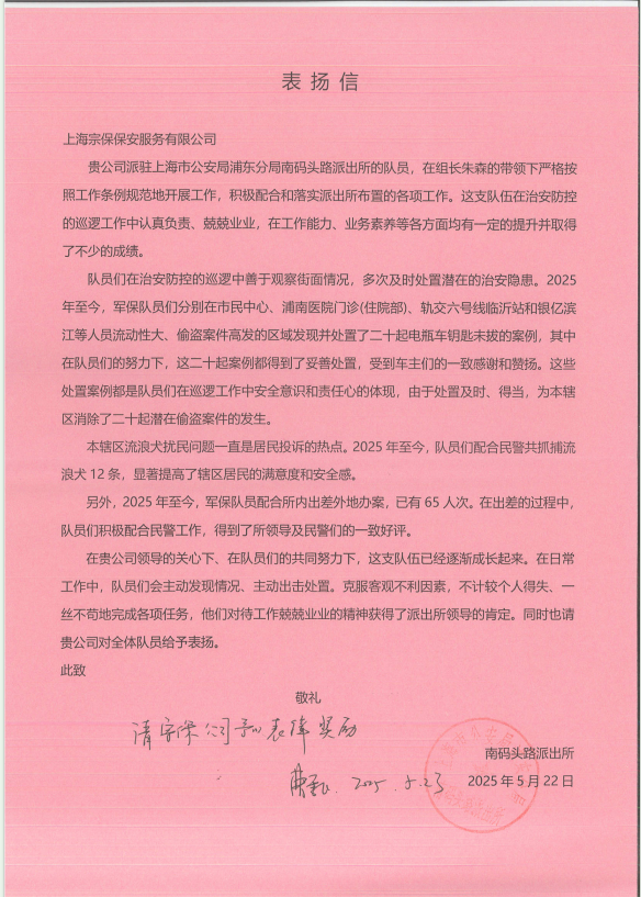 5月22日,宗保公司駐浦東新區(qū)南碼頭派出所輔助項(xiàng)目收到派出所的表?yè)P(yáng)信,表?yè)P(yáng)項(xiàng)目組長(zhǎng)朱森,愛(ài)崗敬業(yè)、任勞任怨,素質(zhì)過(guò)硬、責(zé)任心強(qiáng),團(tuán)結(jié)帶領(lǐng)公司項(xiàng)目員工嚴(yán)格遵守派出所各項(xiàng)管理規(guī)定,全力配合派出所做好治安巡邏工作的優(yōu)異表現(xiàn)。(供稿人:康占峰)