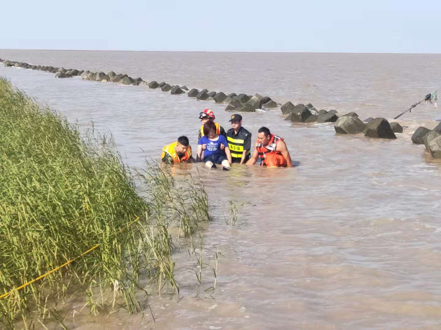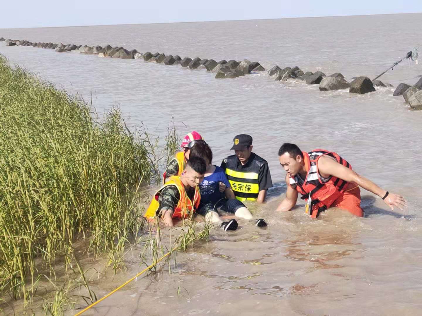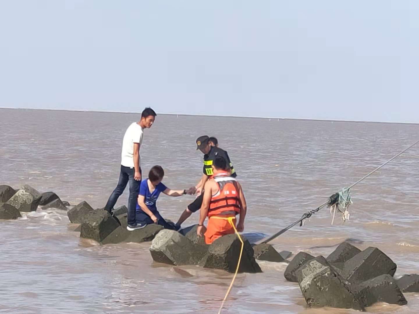 “快看那邊,水里有人?!?0月2日下午14:10,宗保特保隊(duì)員在海堤上巡查時,發(fā)現(xiàn)在海水中的礁石上困著一對青年男女。當(dāng)時,海水不斷上漲,很快就要淹沒礁石,兩名游客緊張得瑟瑟發(fā)抖,情況危急。