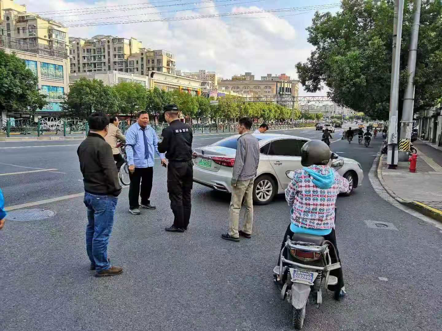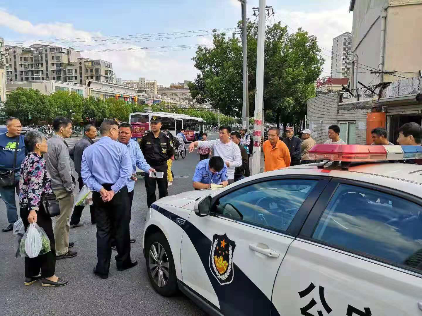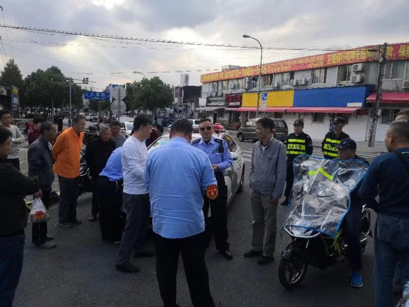 周登輪第一時間安排隊員疏散人群,引導兩輛車靠邊疏通道路,并找雙方了解情況進行協(xié)調(diào)。但由于雙方都比較激動,協(xié)調(diào)未果,小周向事發(fā)區(qū)域楊思派出所上報情況。派出所迅速出警。