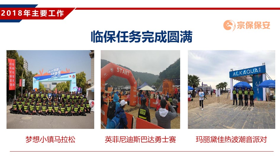 為百姓排憂解難,為政府保駕護航。夢想小鎮(zhèn)半程馬拉松賽,2000多名隊員從上海奔赴杭州保障,人數(shù)多、距離遠、戰(zhàn)線長,既是管理能力的考驗,也是公司實力的展示;“五一”、“十一”臨港系列活動,人防、技防相互支撐、互相補位,成效顯著;英菲尼迪斯巴達勇士賽、中國時尚大會、中國青年數(shù)字經(jīng)濟創(chuàng)業(yè)大賽、杭州星空長灘音樂狂歡、西湖公共關系論壇會議等,大型活動安保一項接一項,人氣爆棚,又秩序井然?;顒蝇F(xiàn)場秩序維護、交通疏導、路線警衛(wèi)、停車場管理,處處都有宗保人的身影。有作為才能有地位。腳踏實地的宗保人用自己的實際工作贏得了社會的認可和尊重。