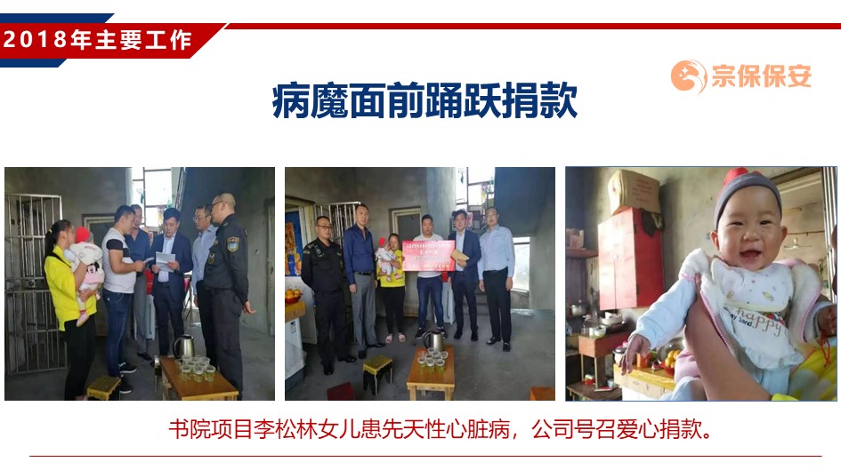 病魔無情,小孩重病陷困境;宗保有愛,踴躍捐款暖人心。2018年2月書院項目隊員李松林的女兒查出患先天性心臟病。高額的手術費使這個本就不富裕的家庭雪上加霜。病魔無情人有情。公司發(fā)出“愛心捐款、情暖員工”號召,隊員們紛紛伸出援助之手,慷慨解囊,獻出自己的一份愛心。一時間,公司形成了一片“愛的海洋”。一筆筆捐款匯聚著一股股暖流,短短幾日,便募集愛心捐款70460元。捐款活動充分體現(xiàn)了公司廣大員工團結友愛、互幫互助的美德;彰顯了公司奉獻、友愛、互助、進步的時代新風。
