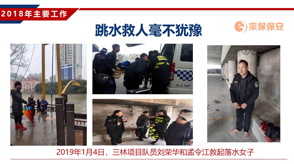 疾風知勁草,危急見忠誠。2019年1月4日,三林項目隊員劉榮華和孟令江巡邏執(zhí)勤時,發(fā)現(xiàn)有一名女子落水,情況十分危險。劉榮華迅速跳入水中施救;孟令江用繩索配合救援,兩人合力將女子救起。劉榮華和孟令江只是無數(shù)宗保好人的具體代表。2018年,全公司共交還遺失財物20多萬元,拒收賄賂10多萬元,找回走失兒童9人,300多人次打不還手、罵不還口,堅持文明值勤?!吧蠉徧峁┓?,微笑增添力量,刁難接受考驗,忍辱造就和諧”的服務理念已經(jīng)深深烙在每一名宗保人的心中。