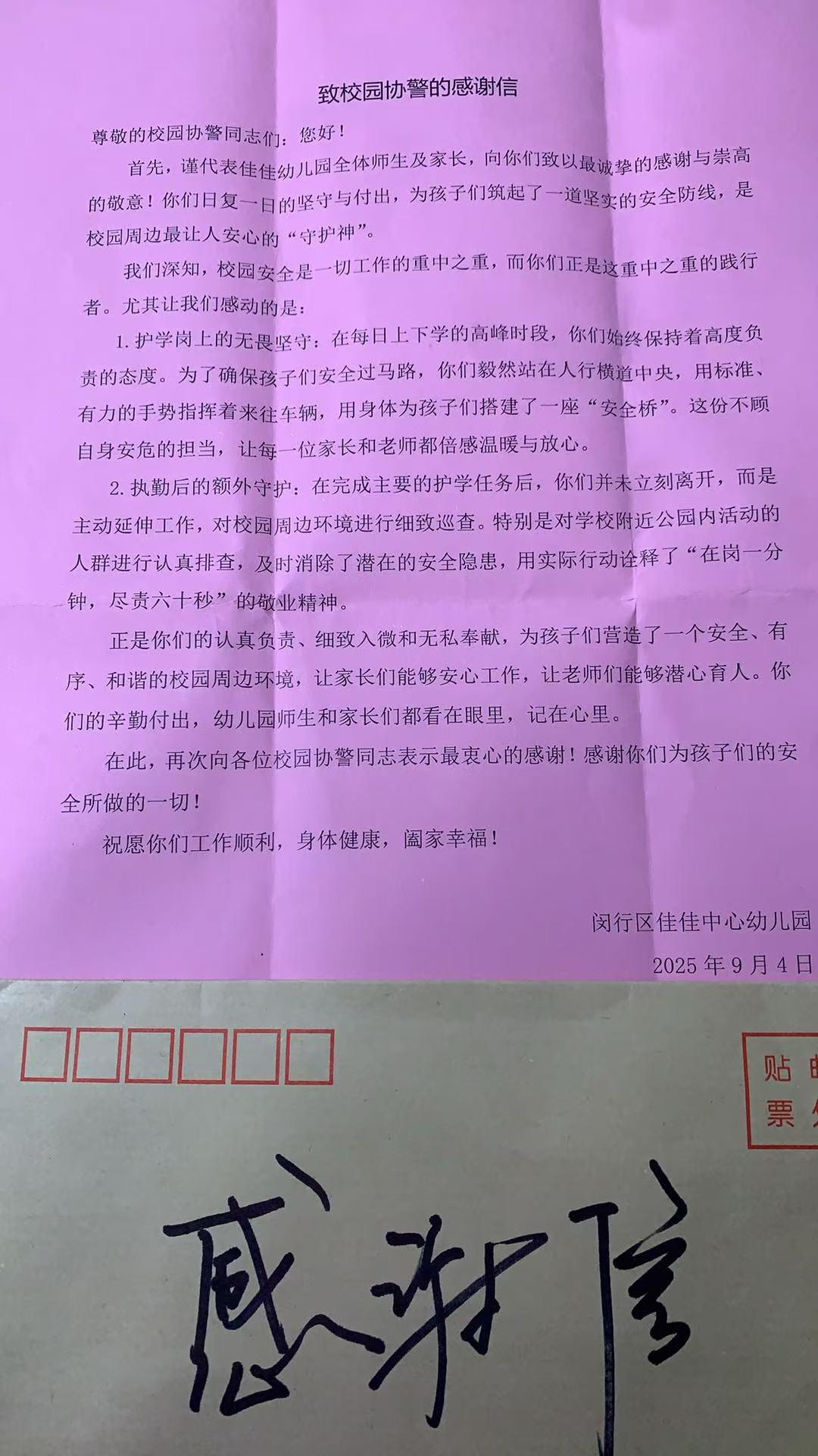 中心幼兒園感謝公司員工們?cè)谧o(hù)校期間盡職盡責(zé)、任勞任怨的辛勤付出,贊揚(yáng)員工們圓滿完成護(hù)校任務(wù),主動(dòng)提供暖心護(hù)航,所展現(xiàn)出的良好職業(yè)素養(yǎng)和服務(wù)意識(shí)。