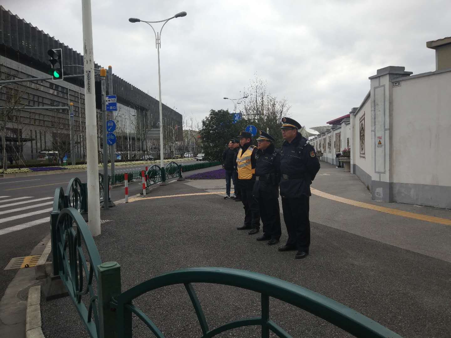 兩會期間正值寒冷冬日,室外溫度低,北風(fēng)呼嘯,甚至伴有雨雪。宗保特保隊員冒著寒風(fēng)冷雨依然堅守在自己的崗位,參與在交通輔警和城管輔警行列中,協(xié)助指揮車輛和引導(dǎo)人員進出。