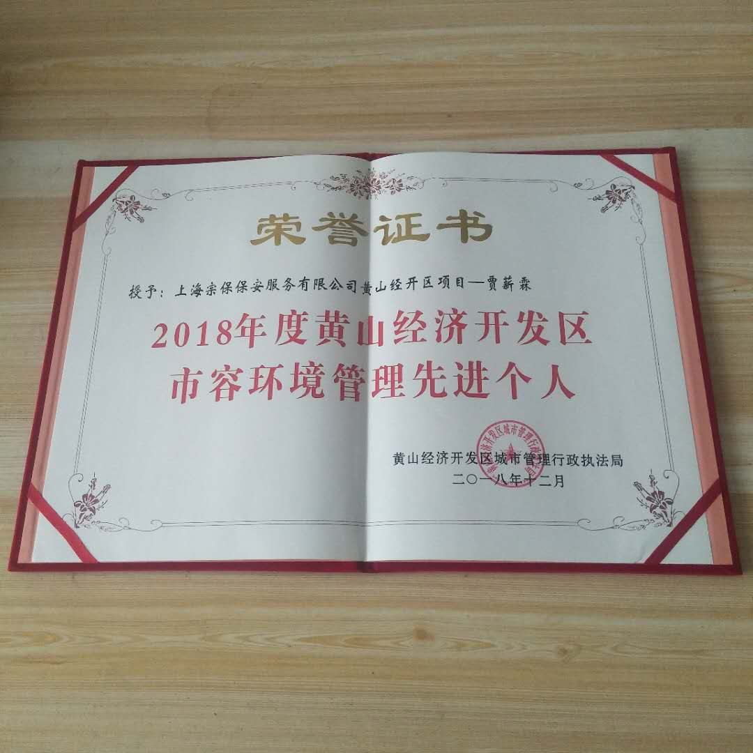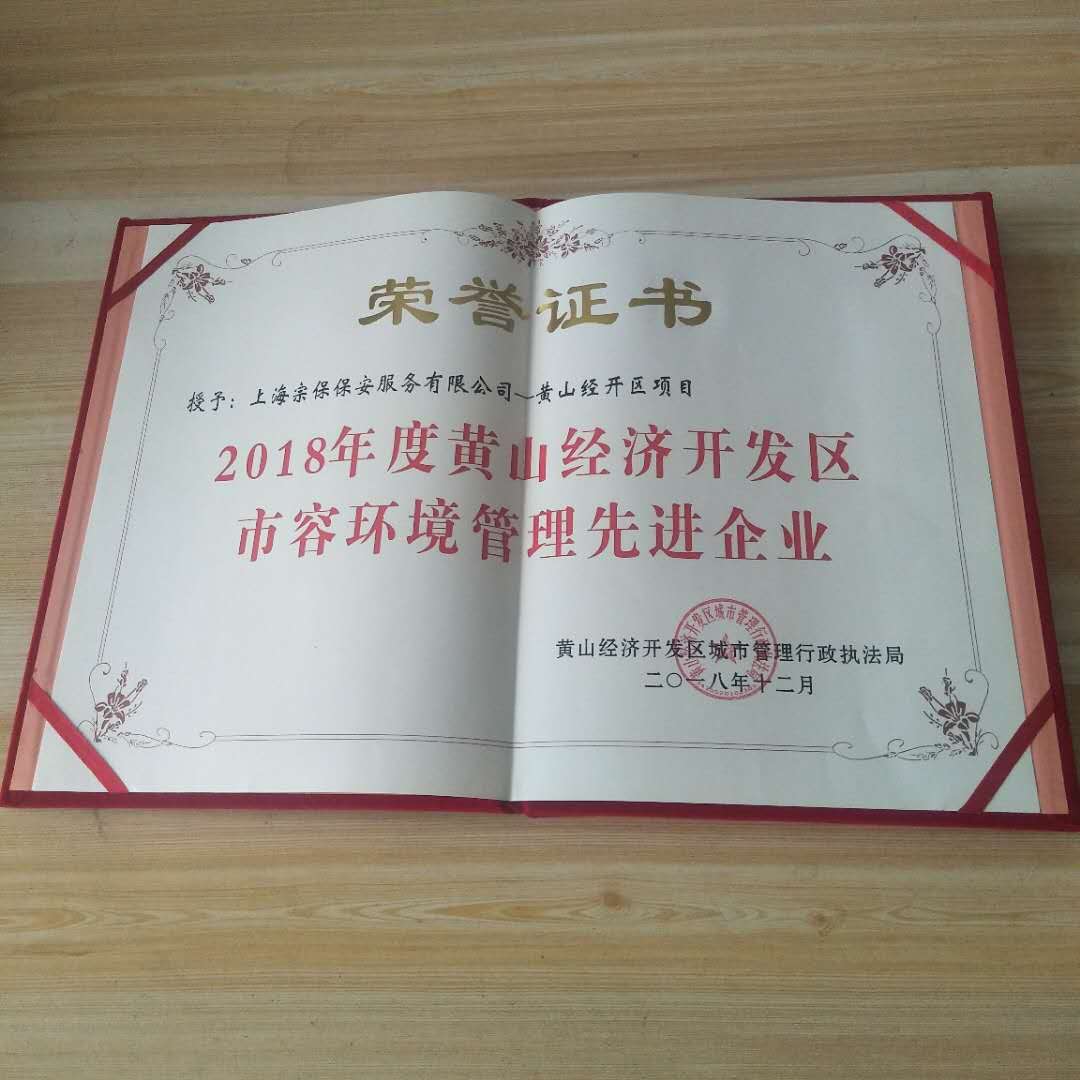 2019年2月2日,黃山經(jīng)濟(jì)開(kāi)發(fā)區(qū)城市管理行政執(zhí)法局劉局長(zhǎng),為上海宗保頒發(fā)“2018年度黃山經(jīng)濟(jì)開(kāi)發(fā)區(qū)市容環(huán)境管理先進(jìn)企業(yè)”及“2018年度黃山經(jīng)濟(jì)開(kāi)發(fā)區(qū)市容管理先進(jìn)個(gè)人”榮譽(yù)證書(shū)