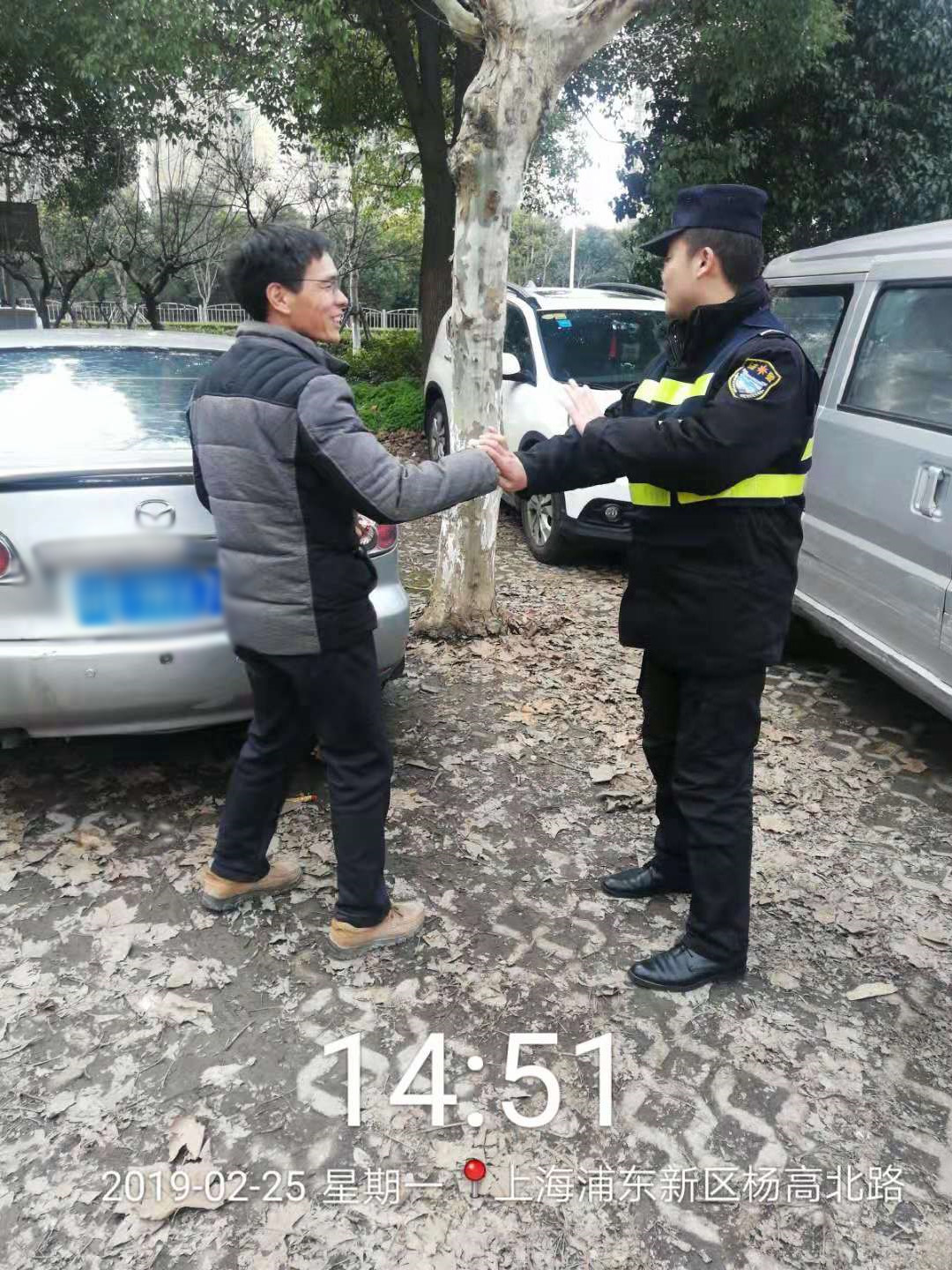 當(dāng)日14:38,金橋輔警項目組長薛興旺和隊員孫毛毛在佳高路巡邏期間,發(fā)現(xiàn)一輛白色本田SUV沒有鎖車門,車內(nèi)無人。隊員在車輛擋風(fēng)玻璃后發(fā)現(xiàn)車主電話,隨即撥打車主電話說明情況。10分鐘左右,車主來到現(xiàn)場,將車門鎖好。車主拿出香煙給隊員,用來感謝宗保隊員熱心告知,被隊員婉言謝絕。