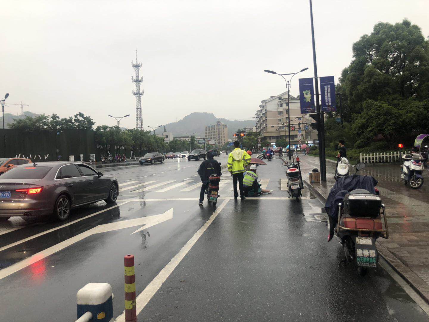 當日17:40左右,隊員李丹、李寶玉和王春陽在閑興路永樂商務(wù)酒店附近巡邏,發(fā)現(xiàn)在不遠處非機動車道上發(fā)生兩電動車事故,一方逃逸,一方受傷倒地??吹酱饲闆r后,隊員第一時間上前維護現(xiàn)場報警并上報當日值班。在接到中隊指令現(xiàn)場取證完畢后,詢問得知傷者傷勢不是很嚴重,隨后護送傷者到閑林衛(wèi)生院進行醫(yī)治。