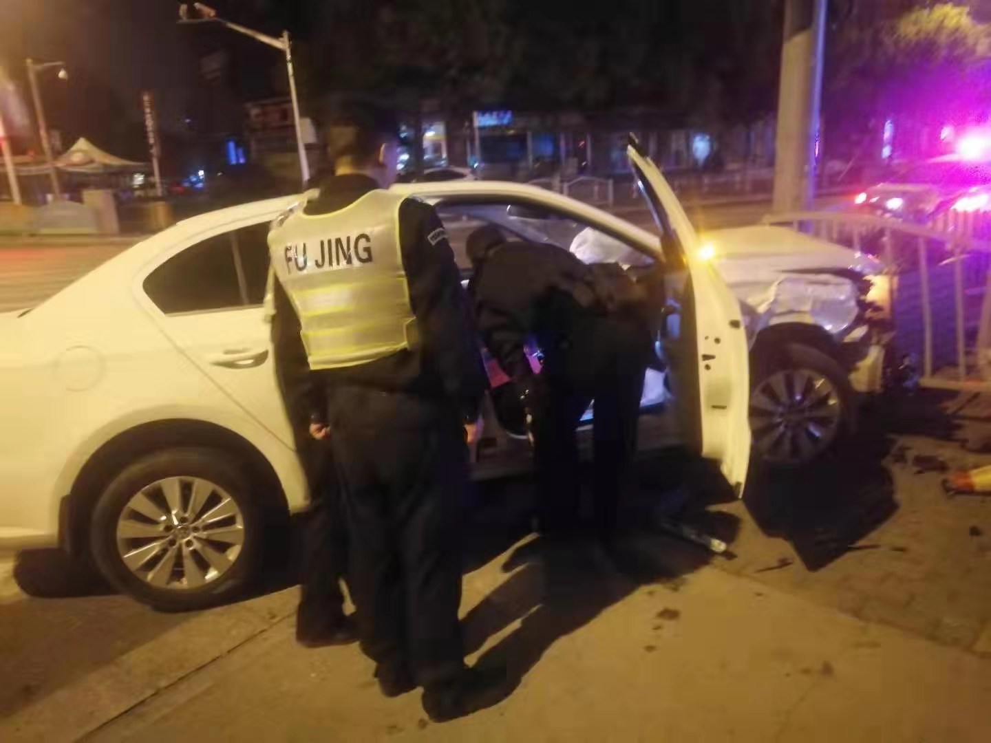11月1日凌晨04:20分,宗保公司駐金橋輔警項目夜班組組長薛興旺和駕駛員孫智明開車巡邏至金高路與東陸路交界處,看到一起車禍,一輛白色大眾轎車由于車速過快,追尾一輛五菱宏光后發(fā)生二次碰撞,撞到紅綠燈燈柱。