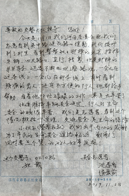 宗保公司駐閔行交通輔警二大隊項目吳中路蓮花路崗位的戴文彬,因?qū)I(yè)的指揮手勢、認(rèn)真敬業(yè)的工作態(tài)度,得到閔行安全志愿者和廣大群眾的認(rèn)可,收到了安全志愿者的一封表揚信。
