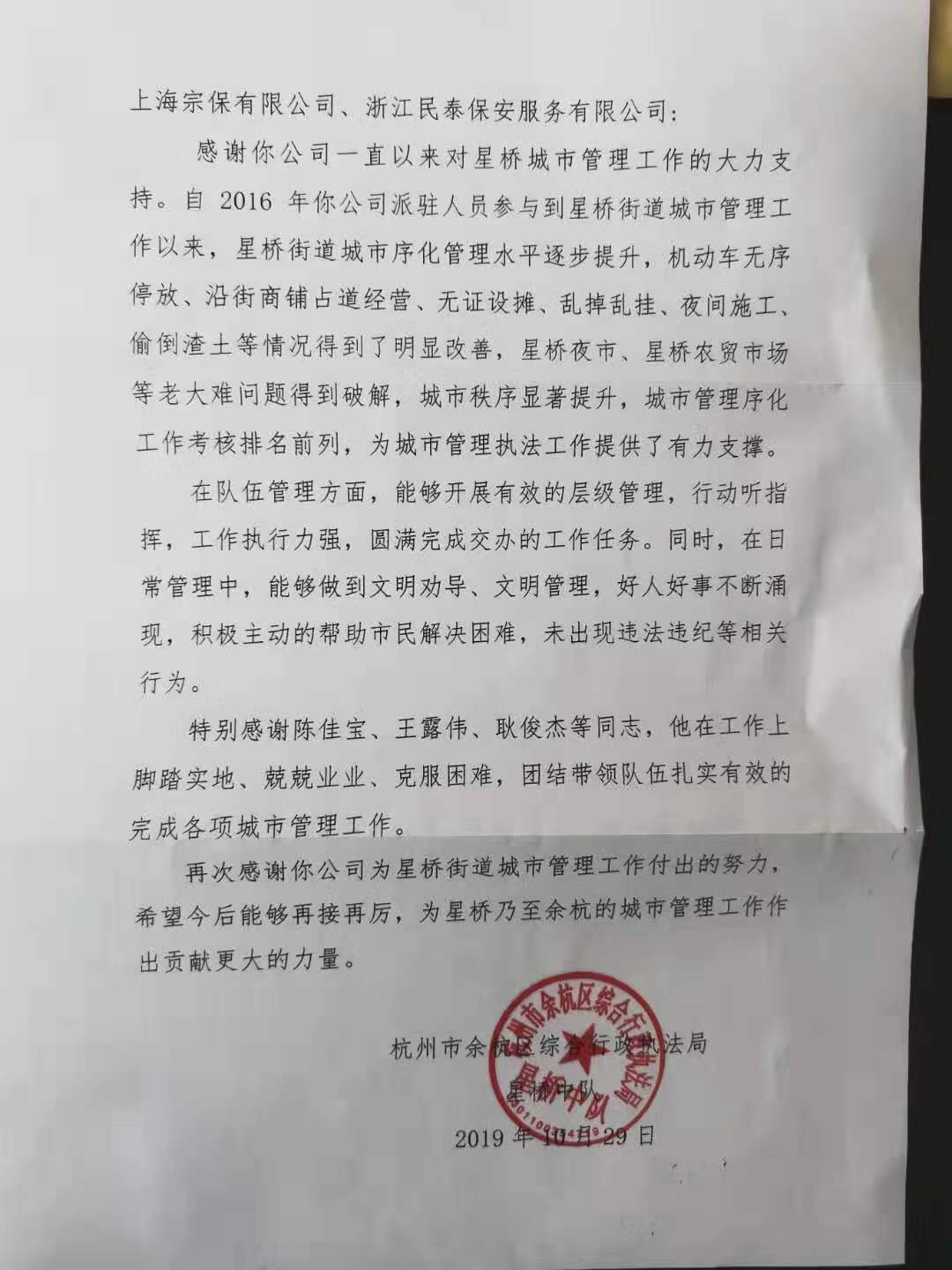浙江民泰駐余杭區(qū)星橋街道市容輔助管理項目的陳佳寶、王露偉、耿俊杰,三位隊員因在工作中兢兢業(yè)業(yè)、盡職盡責(zé)、腳踏實地,帶領(lǐng)團隊出色地完成各項城市輔助管理工作,收到了余杭區(qū)綜合行政執(zhí)法局星橋中隊的一封表揚信。