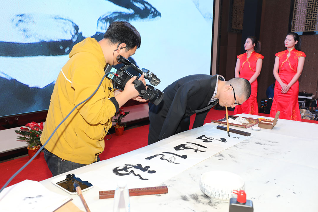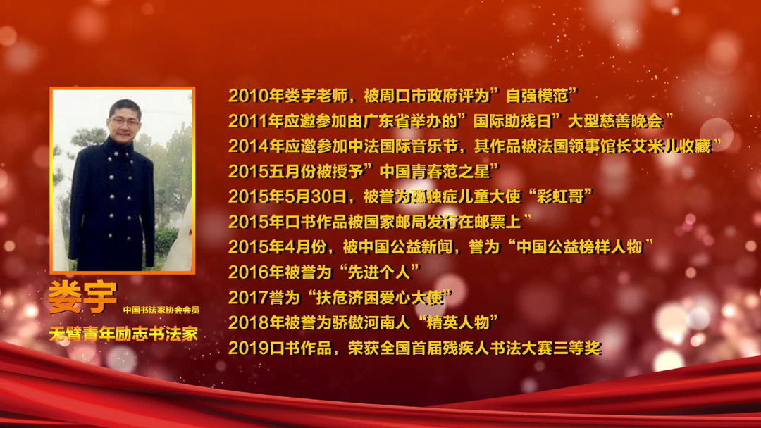 晚會(huì)現(xiàn)場(chǎng)特邀著名的青年勵(lì)志書(shū)法家?jiàn)溆钕壬桥_(tái)互動(dòng)。婁宇先生是北京書(shū)法家協(xié)會(huì)會(huì)員、“中國(guó)青春范之星”,他用嘴執(zhí)筆現(xiàn)場(chǎng)表演書(shū)法?,F(xiàn)場(chǎng)所有人自發(fā)起立,為其鼓掌、叫好。