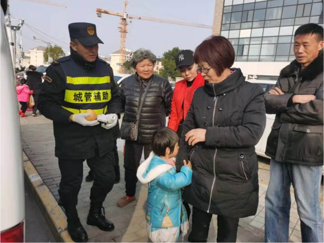 此時(shí),宗保公司駐周浦城管項(xiàng)目輔助人員王安斌在周市路關(guān)岳路的鎮(zhèn)黨建中心門口見到了這個(gè)驚慌失措的小姑娘。據(jù)王安斌回憶說,當(dāng)時(shí)正好是下午三時(shí)左右,黨建中心門口有一名四歲左右的女童獨(dú)自在馬路邊哭泣。王安斌見狀立即停止巡查,上前詢問情況。原來,這個(gè)小姑娘和家里人走失了,說不清楚家庭地址和家人電話。王安斌立即將此情況上報(bào),并告知附近2公里的隊(duì)員注意街面巡查時(shí)有無尋找孩子的人員。半個(gè)小時(shí)后消息傳來,周市路中大街附近,有個(gè)女子神色慌張,不停地在打電話聯(lián)系。隊(duì)員立即通知王安斌帶孩子前來。終于,走失的孩子找到了外婆,大人孩子破涕為笑。老夫妻對王安斌急群眾所急的善舉不停地表示謝意,并要買來香煙作為感謝。王安斌婉言謝絕,用他的話說:我只是做了我應(yīng)該做的,我雖然不是正式隊(duì)員,但我身上穿的衣服印有“城市管理”,我也有責(zé)任做好身邊的每一件事。