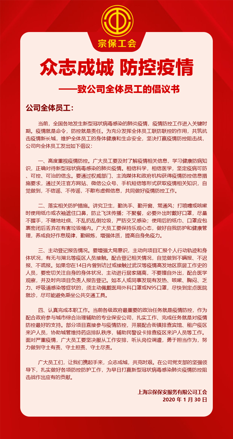 眾志成城 防控疫情 ——致公司全體員工的倡議書